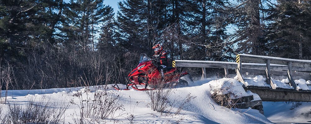 The SRV front suspension geometry is aimed at managing spindle camber, resulting in minimized bump-steer and maximized cornering bite giving rider confidence in varying trail conditions. The A-arms are mounted at a 30-degree angle from the sled's centerline to efficiently dissipate impact force throughout the entire chassis. Likewise, the front shocks mount directly to the leading spar so that trail forces are routed to the strongest part of the chassis. Wide A-arm spacing minimizes flex and stress in the front suspension system, which means consistent and confident corner handling. -