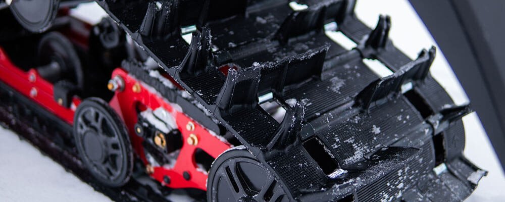 This 153" long Power Claw track uses 2.25" lugs in a 3.0 pitch configuration. The forward-curved-edge lugs are beneficial when the powder is heavier, and helps to keep things hooked up when pulling a heavy load or breaking trail. The 153" length coupled with the articulated skid-frame gets it done regardless of the task at hand. -