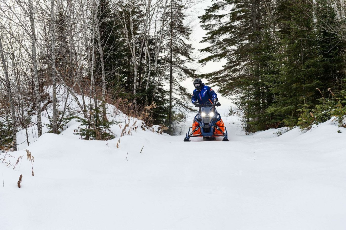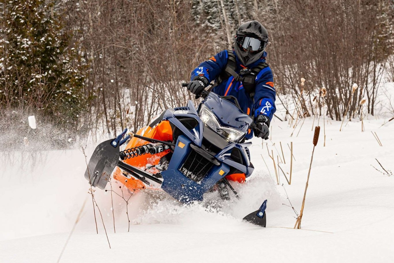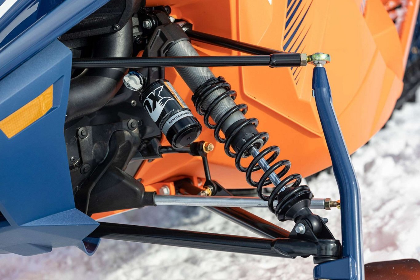 - The sleek SRV-M Front Suspension is ultra compact to reduce unwanted spindle and suspension component drag in deep snow. The narrow stance allows for extreme maneuverability and delivers aggressive lean angles for incredible side-hilling and powder turn capabilities. The lightweight, forged aluminum spindles join the widely spaced upper and lower control arms producing a large caster angle for tight side-hilling and ease of steering. The clean, narrow overall stance and elimination of the sway bar also greatly enhances deep snow agility.