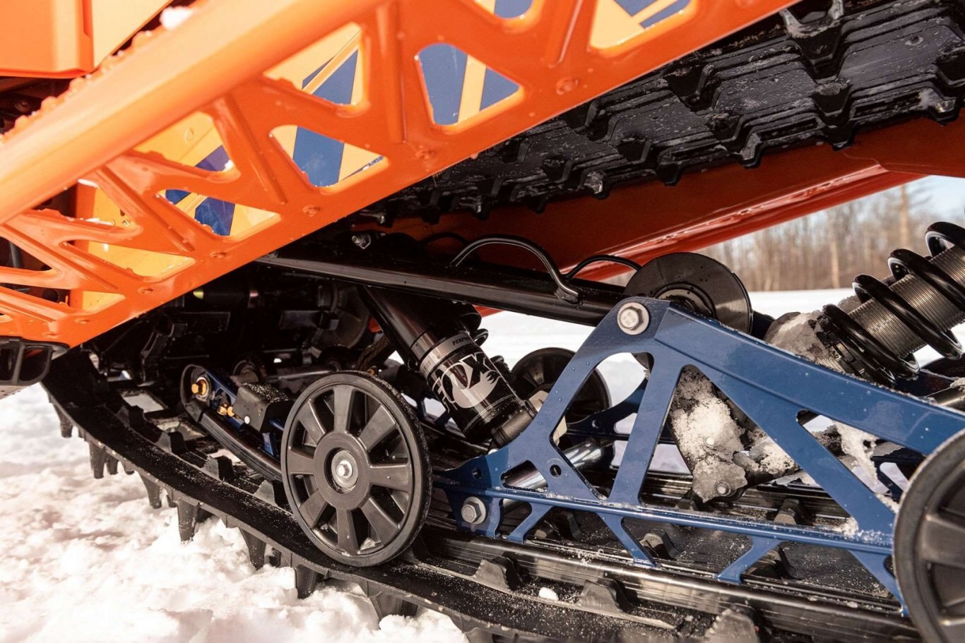 The Limited B-TX receives a full complement of top shelf Fox QS3 shock absorbers. The front suspension gets twin, coil-over QS3 with remote reservoirs and 3-way QS3 damping adjusters. The front skid frame arm gets a QS3 1.5 and the rear arms QS3 2.0 with remote reservoir and 3-way damping adjuster to perfectly matched the front end. These shocks all include Fox FIST ice scraper technology, velocity sensitive damping and high quality hard chrome rods with T6 anodized bodies. |