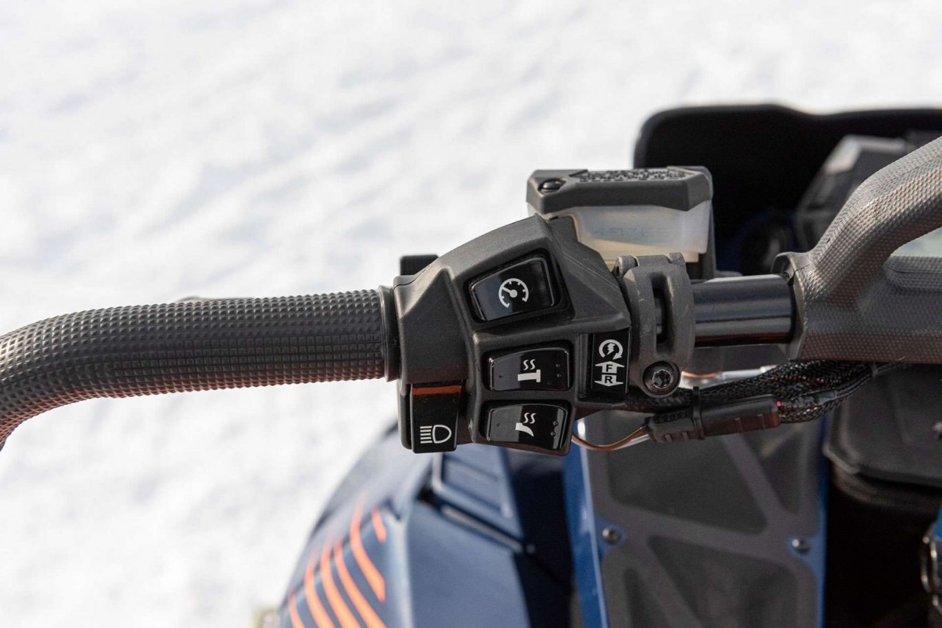 - The handle bar controls feature a left hand switch cluster which allows for 'on the fly' access to the multi-step hand and thumb warmer adjusters. Information available on the multi-function gauge can be easily selected with a convenient toggle switch and the push button reverse gear switch is also located in the left hand cluster. The right side of the bar is clean with an ergonomically shaped throttle lever and simple, stand-alone emergency stop switch. The Hayes 'Stealth' brake cylinder is equipped with a composite brake lever providing great modulation for better feel and powerful stopping performance.