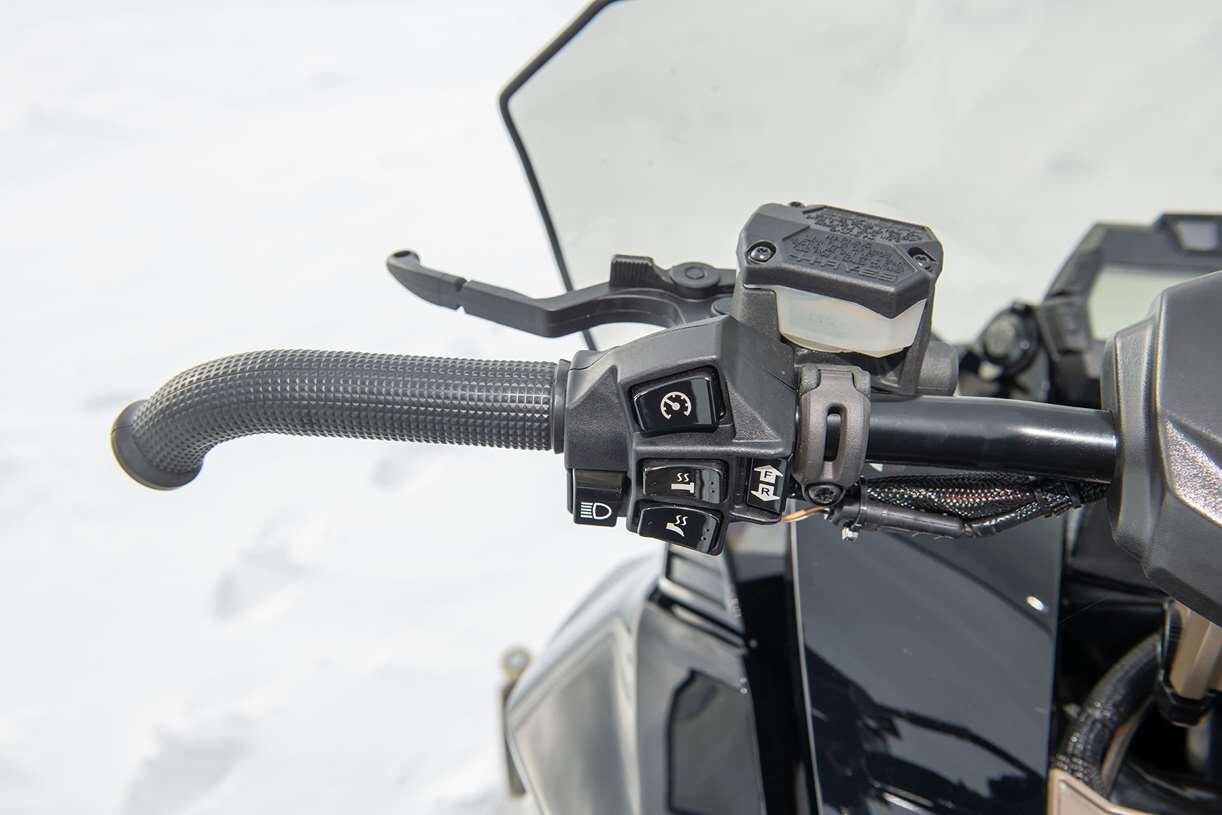 • The handle bar controls feature a left hand switch cluster which allows for 'on the fly' access to the multi-step hand and thumb warmer adjusters. Information available on the multi-function gauge can be easily selected with a convenient toggle switch and the push button reverse gear switch is also located in the left hand cluster. The right side of the bar is clean with an ergonomically shaped throttle lever and simple, stand-alone emergency stop switch. The Hayes 'Stealth' brake cylinder is equipped with a composite brake lever providing great modulation for better feel and powerful stopping performance.
