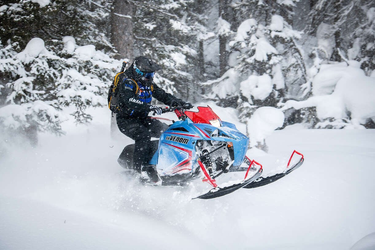 Yamaha’s Venom Mountain offers new riders a better chance to enjoy the altitude. The compact fuel-injected 397cc two-stroke engine and lightweight chassis make the Venom Mountain more than capable of exploring that next bowl. Venom Mountain also gets the same Mountain Single Beam skid frame as the Mountain Max with the single-pivot, single-rail design allowing the 146-inch footprint to go anywhere, anytime. Electric start, reverse, and high and low hand warmers give you all the features of a big sled in a nimble lighter package. Ski stance. Moving to 36” stance from 38” stance (35.5”-37.5” w/adjustment). Improved maneuverability in deep snow. Lightweight mountain seat. Taller height for ease of sit-down to stand-up riding, weight reduction. 10.4 gallon vs. 11.7 gallon. Weight reduction, mates with lightweight mountain seat.