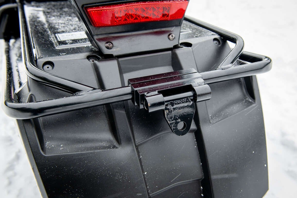 • The long-travel rear suspension features a hinged, spring-loaded tail-end section that allows the rear idler wheels to travel upwards in an arc when going over bumpy trails making the sled feel and handle like a shorter track model. This articulating features also assists the sled when in reverse by helping guide the track up on top of the snow, not letting it dig in. Another unique feature is offered to lock the rail so it doesn't articulate for maximum traction when pulling a heavy load. A simple 'push pin' is used to engage the rail extension when needed to help keep the skis down and get all the traction possible out of the 153-inch track.