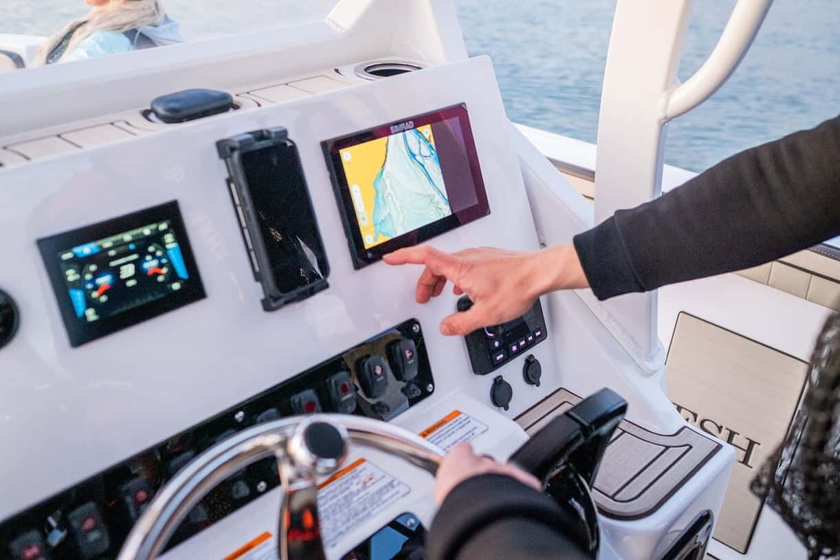 Interior Features 5" Connext with Maps and 9" Simrad Touchscreen Display Throttle-by-Wire Technology Push Button Start/Stop Marine Stereo with Bluetooth, USB and AUX, and 6 Marine Speakers Custom Fit Smartphone Holder Innovative, transparent 68-litre live bait well in the cockpit and insulated self-draining fish locker in the bow Lockable Console Storage and Glovebox Snap-In Teak-style Marine Mat Electric Raw Water Washdown System Bow Cushions Stern Dinette Table Mount Dedicated Anchor Locker, Insulated Fish Box, Front Console Seat, Anchor Locker and Dedicated 5-Gallon Bucket Storage Folding Jump Seats with removable backrests 14 Rod Holders Including Vertical and Horizontal Storage