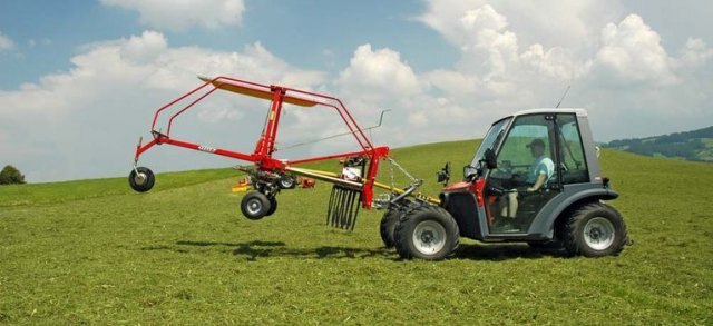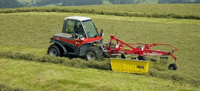 Whether front or rear mounted, with the single-rotor rakes TS 301 DS and TS 351 DS, FELLA offers two all-round performers with rigid headrack for alpine terrain. Due to its low weight and short and compact attachment, these FELLA rakes can be used with a tractor performance level of as low as approx. 20 hp. Ideal for mountainous regions which demand powerful machines, while at the same time carefully handling the sensitive underground structure. The ease of handling of the FELLA single-rotor rake is another impressive feature.