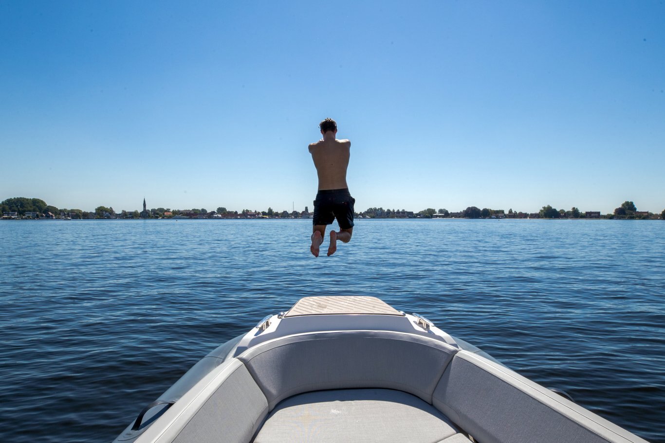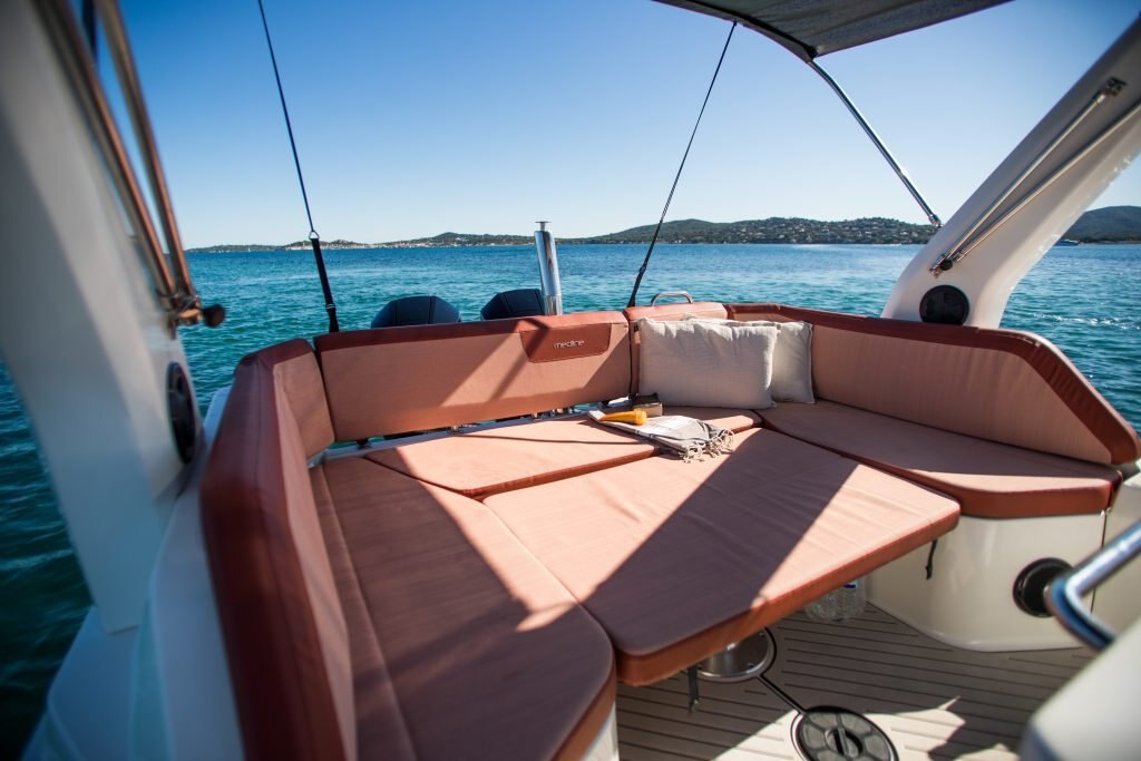 A spacious relaxation area for unforgettable days on the water. Double bow and rear U-Lounge, convertible to a sundeck area. Up to 14 seats in standard equipment, integrated kitchen with sink (optional : grill), console integrating a habitable cabin with toilets (optional : bunk bed space). Triple position bolster for up to two adults + one child. Rear bathing platforms giving access to the sea.