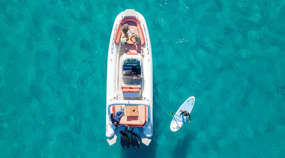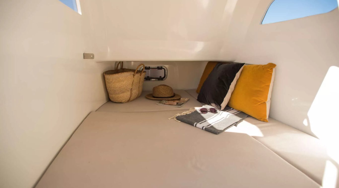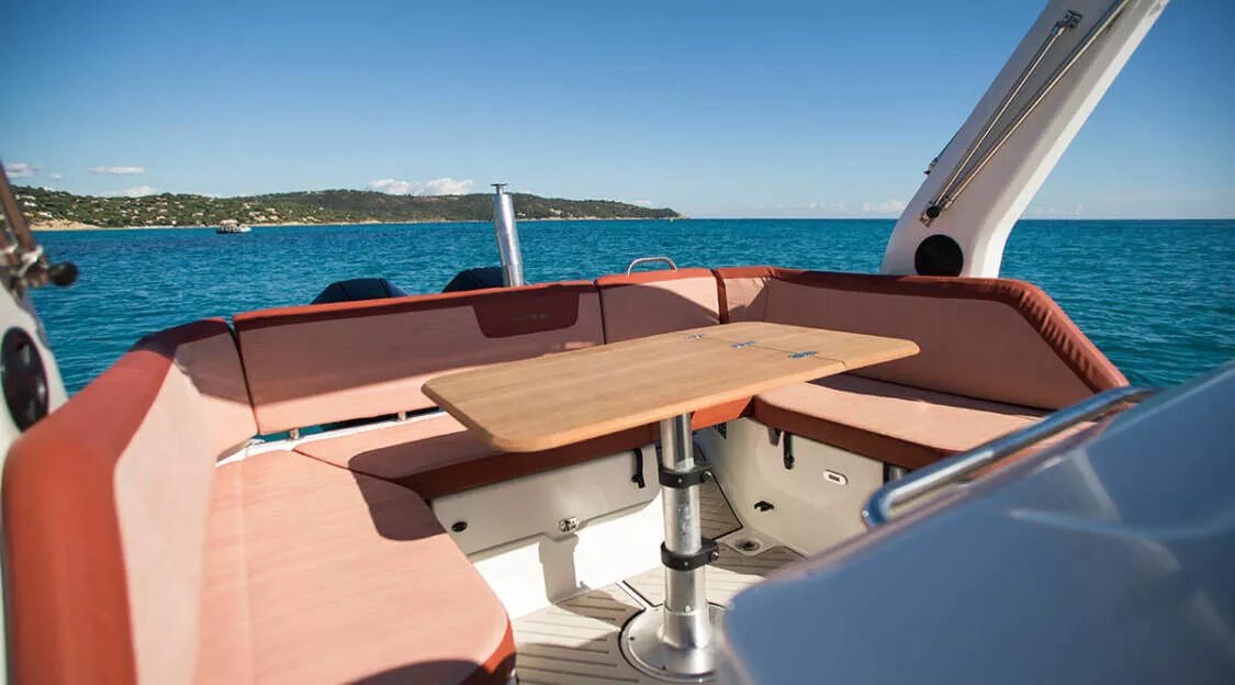 A spacious relaxation area for unforgettable days on the water. Double bow and rear U-Lounge, convertible to a sundeck area. Up to 14 seats in standard equipment, integrated kitchen with sink (optional : grill), console integrating a habitable cabin with toilets (optional : bunk bed space). Triple position bolster for up to two adults + one child. Rear bathing platforms giving access to the sea.