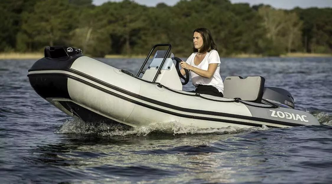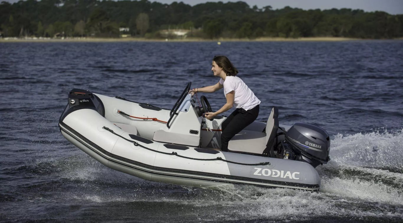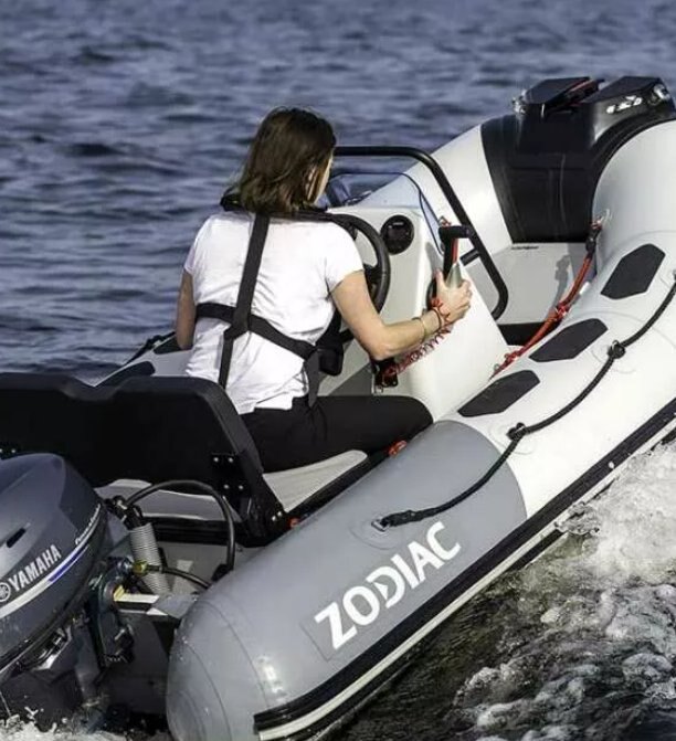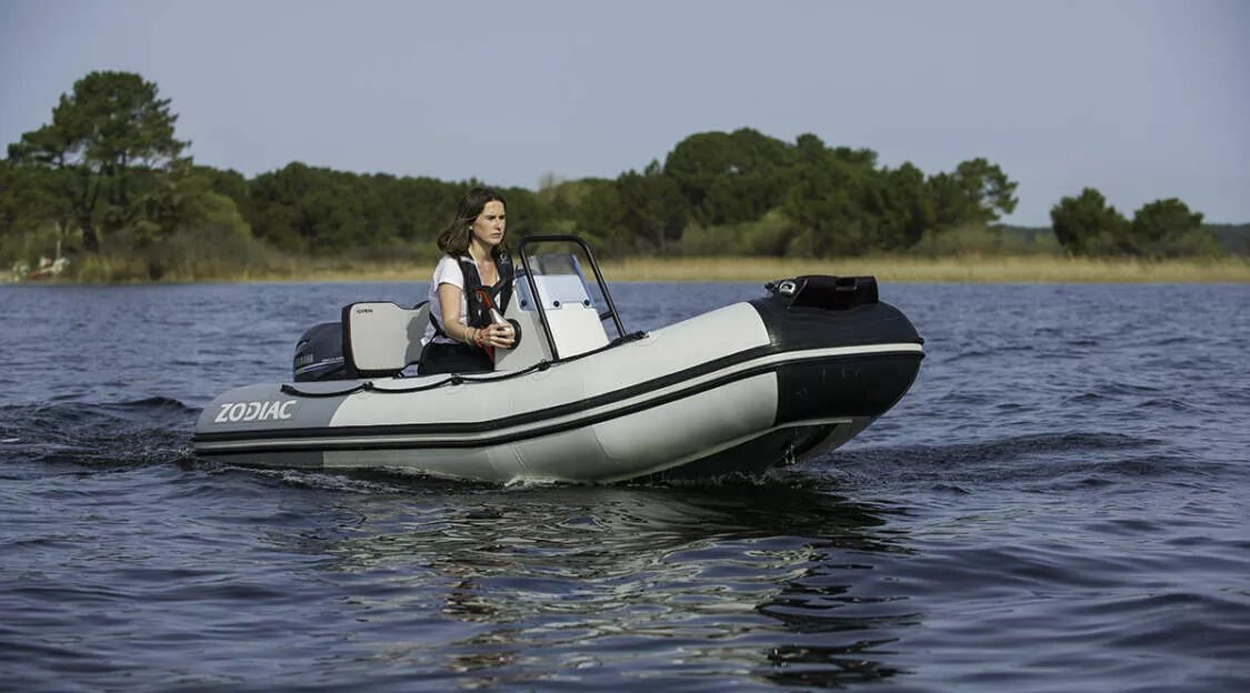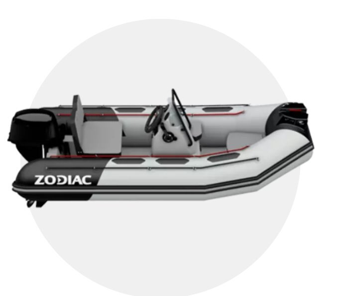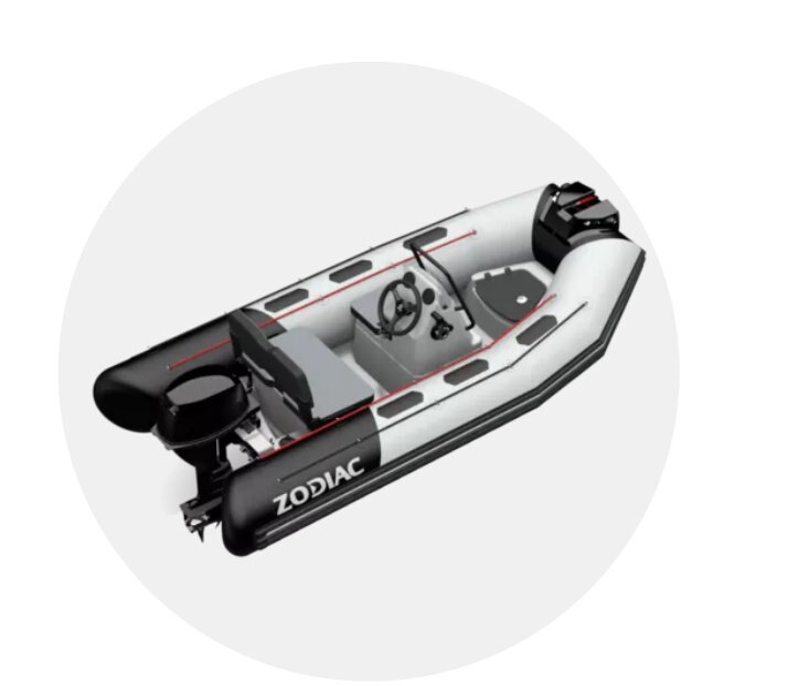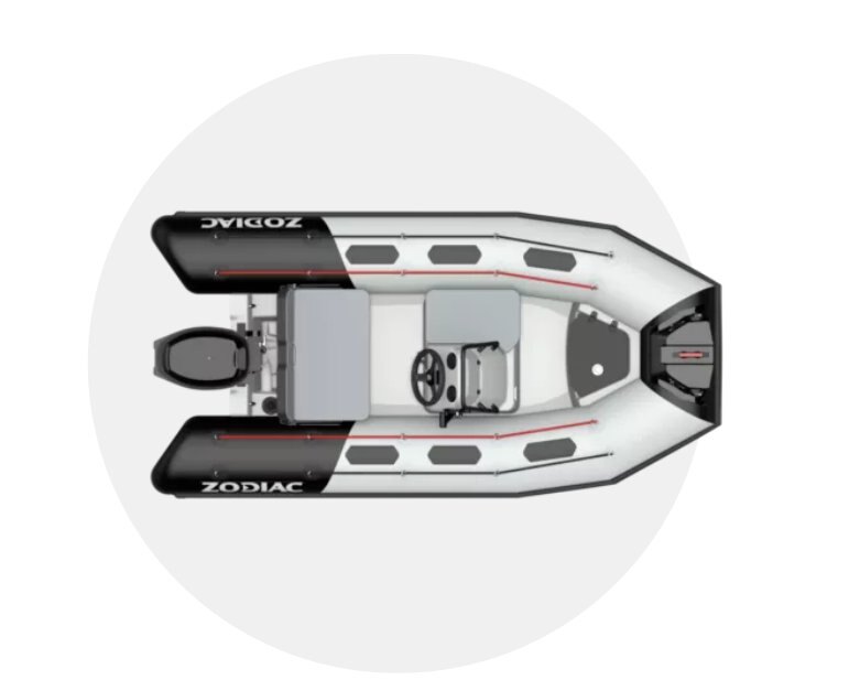 1 GRP Bow Roller 100mm Rubstrake 2 USB Plugs Bench w/ Tilting Backrest Bow Cushion Bow Storage + Cushion Double Lashings Easy Push valves Fairleads Fishtails Cones GRP Deep V-Hull Glued Tube w/ Antiskid Patchs Lockable Mooring Storage Mechanical Steering Navigation Lights Repair Kit Side Seat Under Bench Storage Windshield, Handrail Zodiac Logo on the Tube Console with Wheel 1 Bow Cleat