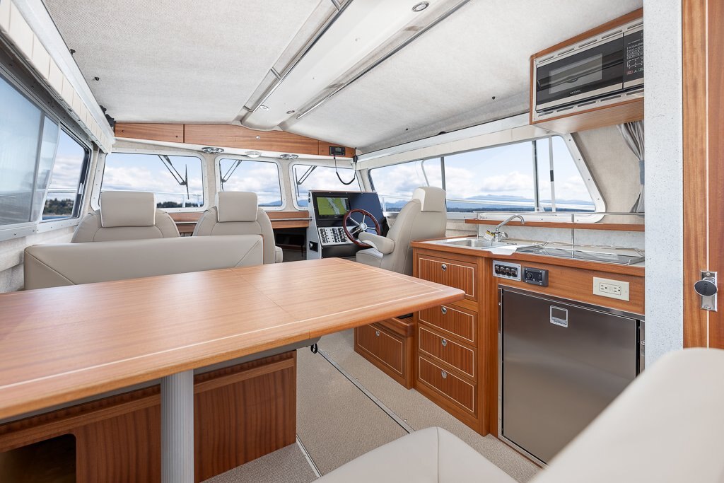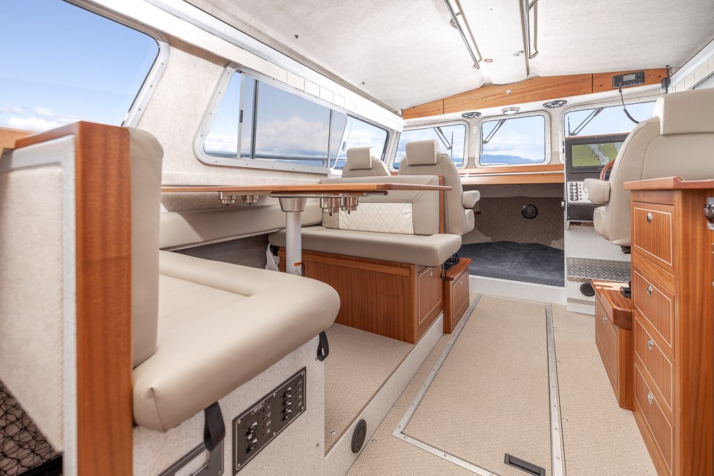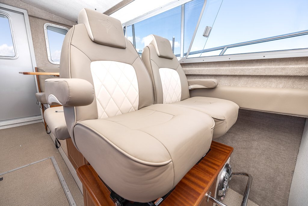 Standard Cabin FeaturesKingleather upholstery coverings with port and starboard full suspension helm seats with slider Solid wood finished helm and dinette seat boxes with storage Dinette seating for 6 converts to queen sleeping berth Stand up enclosed head with 25 gallon holding tank, sink with storage cabinet, electric flush toilet, macerator and deck fill pumps Full lined interior walls and headliner Side cabin window valances with curtains Easy care marine vinyl floor with stainless drains Extra large dash panel for flush mounted electronics Under floor utility locker Solid wood finished radio shelf panel, headstall door & dash trim Mahogany accent stainless spoke steering wheel |