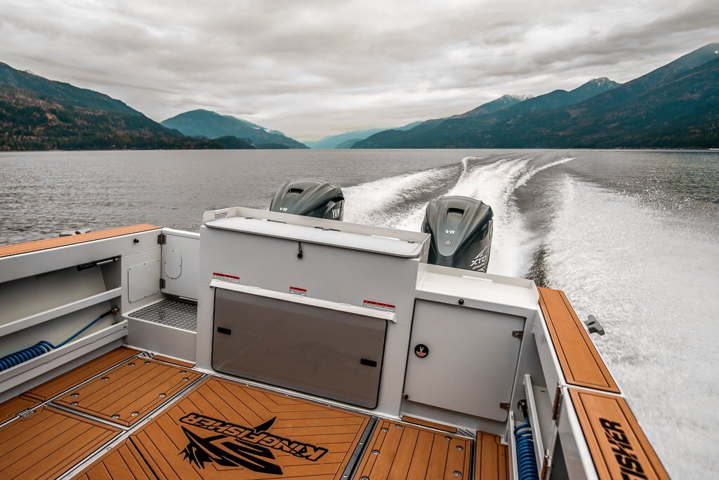 Standard Hull FeaturesExclusive Pre-Flex® hull technology Shearwater bow design with internally reinforced structural impact grid Engineered full length reverse chines Performance lifting strakes Formed compound angle full length box stringers Fully welded bow stem & heavy duty keel guard for 7/16" total keel thickness Fully welded external rub rails / hull stiffeners Closed cell polyurethane foam below cabin deck Anchor rope locker; self draining with interior access hatch Water tight cabin bulkhead with heavy duty weather tight sliding cabin door Forward sloping windshield with 3 aluminum framed safety glass windows Aluminum framed side slider windows with screens and bulkhead windows 3 heavy duty pantographic windshield wipers Raised self-bailing cockpit deck with commercial freeing ports 2 fish lockers in cockpit floor with discharge pumps Transom fish locker with cutting board and fish rail Aft cockpit storage trays and aluminum cockpit toe rail Full width integrated offshore motor bracket with walk-thru transom door Welded bow eye with stainless sleeve and 2 welded aluminum stern eyes 7 x 9" heavy duty welded bow and stern cleats Hydraulic steering with center mount cylinders Stainless steel 1-1/4" diameter bow rail Foul weather bow coamings with hawse rings Bolt on sacrificial hull anodes |