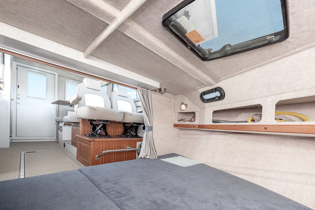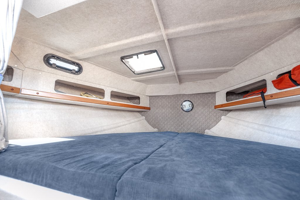 Standard Cuddy Cabin FeaturesFinished cuddy with hull liner and solid wood accent trim Premium fabric v-berth cushion Carpeted storage compartment and overhead shelves Cuddy hatch with screen and 2 portholes with screens |