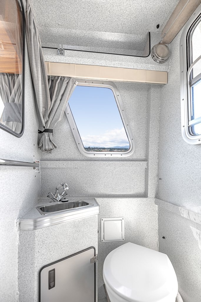 Galley FeaturesHand crafted high gloss solid inlayed wood cabinets with drawers & cupboards Stainless steel sink & 40 gallon fresh water tank 4.6 cubic foot DC fridge with freezer shelf |