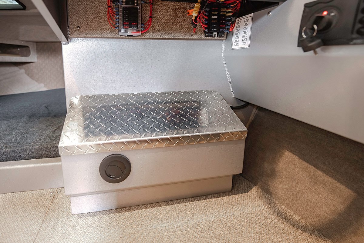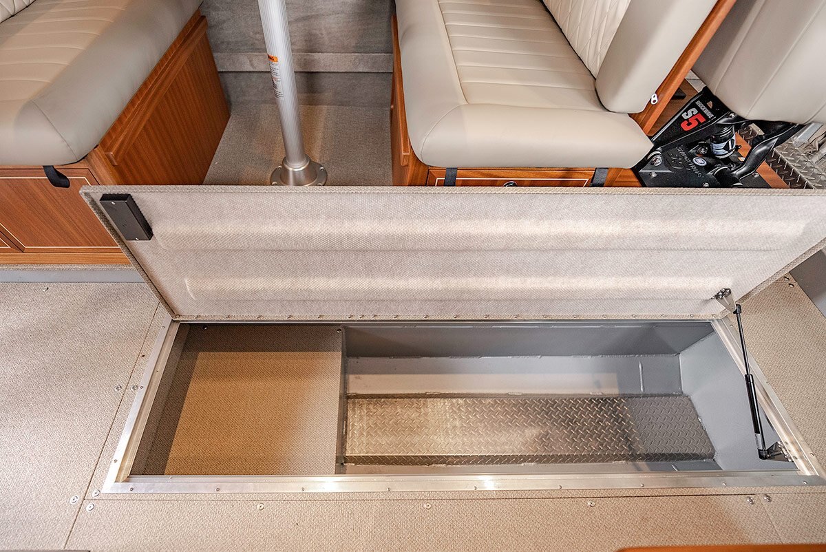 Standard Main Cabin FeaturesTan Kingleather upholstery coverings with port and starboard full suspension helm seats with slider Solid wood finished helm and dinette seat boxes with storage Dinette bench seating for 6 with storage that converts to queen sleeping berth Stand up enclosed head with 25 gallon holding tank, flush toilet, macerator pump and deck side clean out Fully lined cabin walls and head liner Premium heavy duty embossed vinyl flooring XL dash for flush mounted electronics Solid wood finished radio shelf panel, headstall door & dash trim Under floor utility locker |
