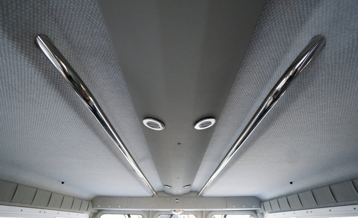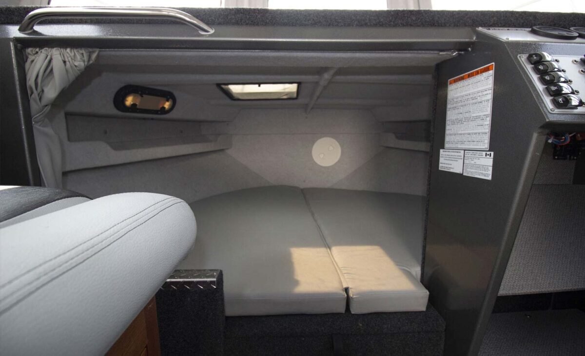 Standard Cabin FeaturesSuspension helm seat with slider Carpeted hull sides from gunnel to floor Finished cuddy with carpeting and hull liner Carpeted storage compartment in v-berth 18" hatch with screen and 2 portholes with screens XL dash panel for flush mounted electronics Carpeted dashboard with raised sill Aluminum overhead radio shelf Easy care marine vinyl floor with stainless drains 6 drink holders |