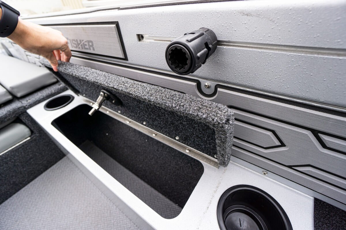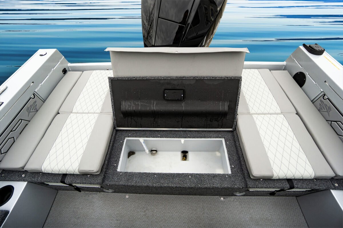 Standard Interior FeaturesSpeckle painted interior Carpeted marine flooring throughout KingDeck Marine material - bow, gunnels & cockpit interior accents Rear mounted re-circulating aerated livewell with timer Center bow deck rod storage for 11 rods (7' 6" to 8' in length) Cockpit storage for 4 rods Sure Catch rail system for gunnel mounted accessories Bow platform dry storage and cargo nets Under floor ski and board storage Lockable side storage 9 drink holders 1 swivel Pro Angler seat on permanent pedestal mounted at helm 2 swivel Pro Angler seats with pinchless hinges on removable pedestals 5 unilock removable pedestal bases (1 bow, 1 aft, and 3 in cockpit) Folding rear jump seats XL dash for flush mounted electronics Anti-feedback steering with sport steering wheel and tilt helm Kicker throttle bracket Anchor light storage |