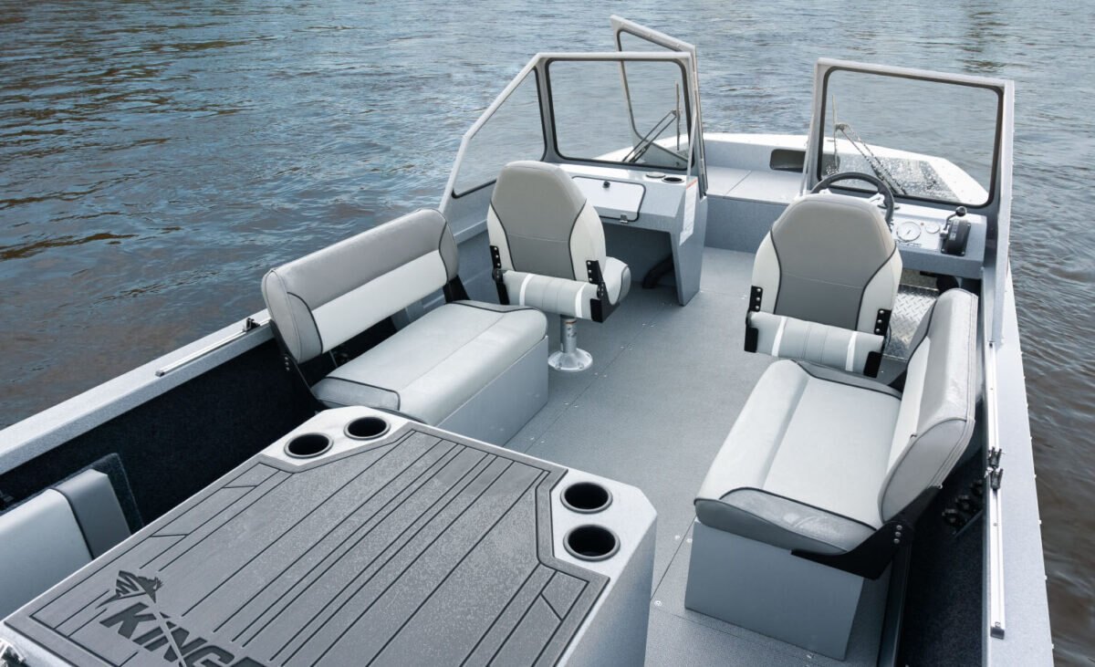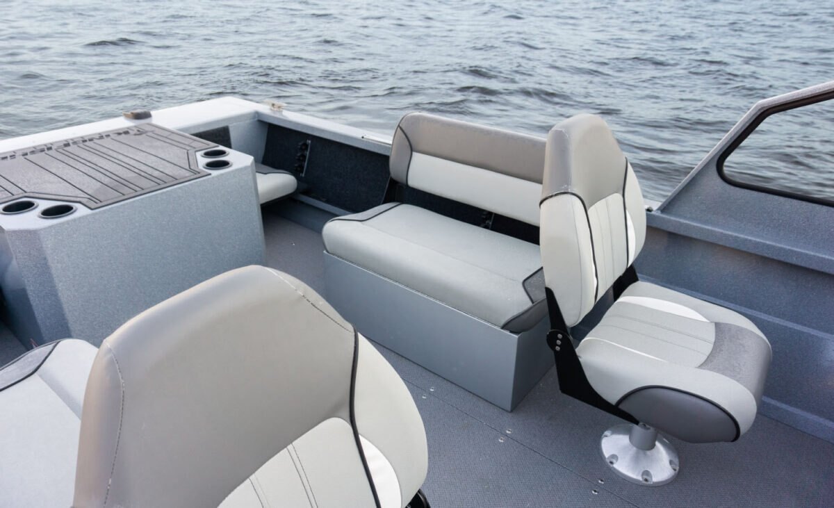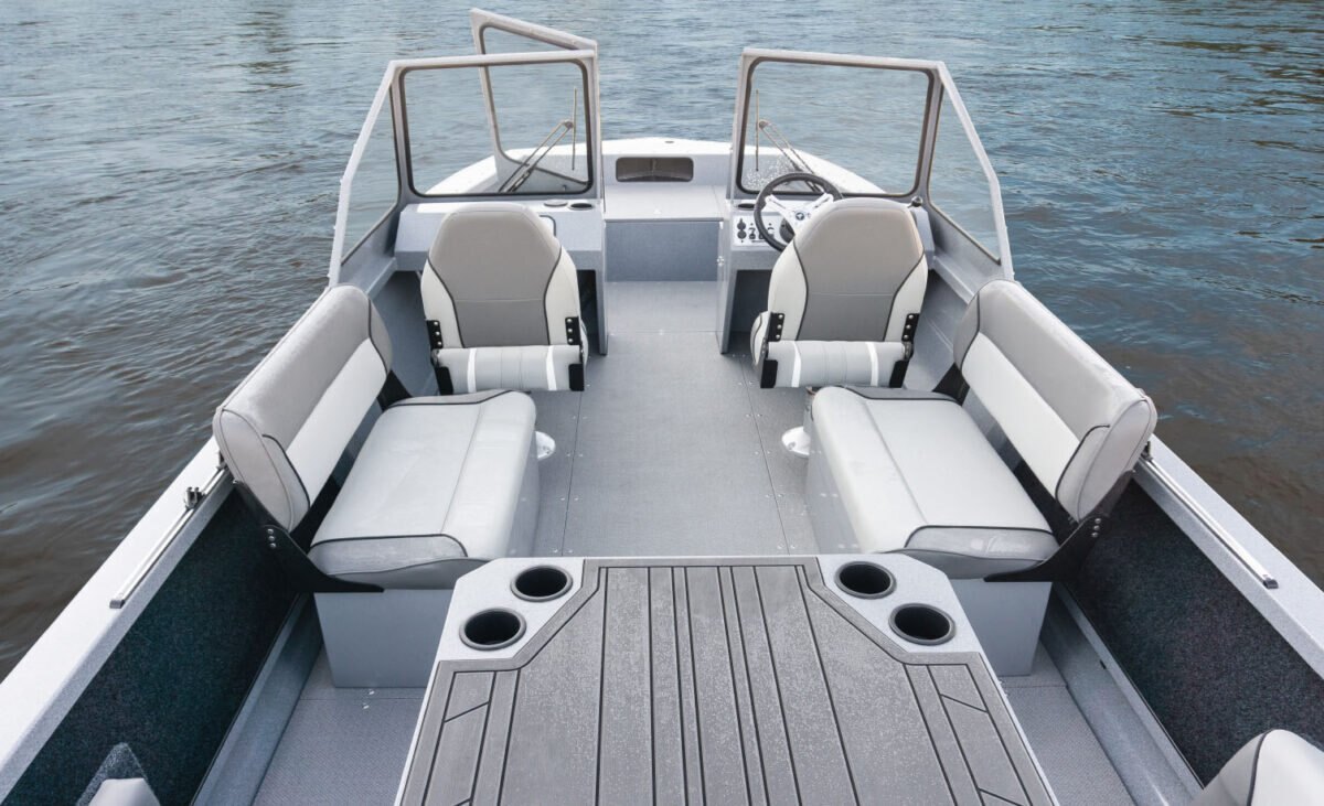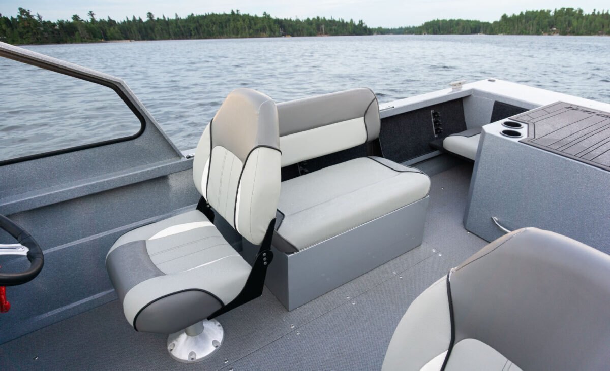 Standard Interior FeaturesEasy care marine vinyl floor 2 swivel Fishmaster XL seats with pinchless hinges on pedestals Binnacle mount throttle and shift Side storage trays Navigational and anchor light storage Port side glove box opening 2 drink holders |