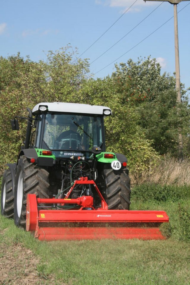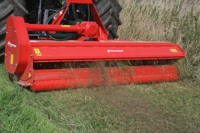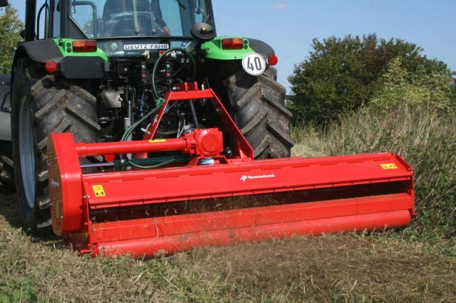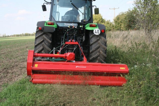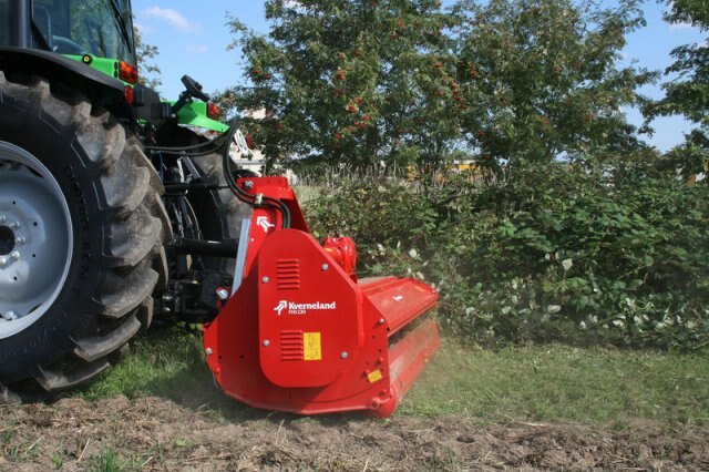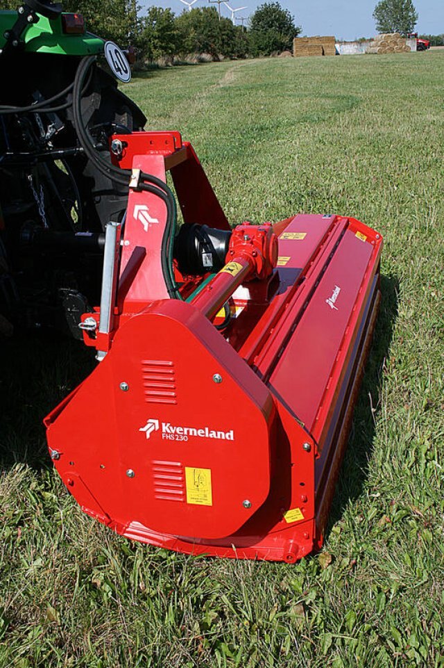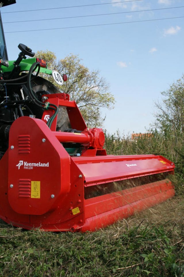 The Kverneland FHS is a compact and heavy duty machine for moderately demanding jobs in soft and top fruit orchards, vineyards and light undergrowth. It is equally perfect for tidying pasture and chopping straw and stubble. The Kverneland FHS is suitable for tractors up to 80 hp. It is available in 1.55m; 1.85m; 2.00m; 2.30m and 2.50m working width. Offset as standard (500mm) increases the versatility of this chopper and caters for safer working conditions. In addition the standard roller and the skids support the chopper in keeping a constant working depth. Highest rotor speeds (2243rpm) in combination with the counterknife and the double skin, guarantee an excellent shredding effect with minimal power requirement. | ||||||||||||||||||||||||