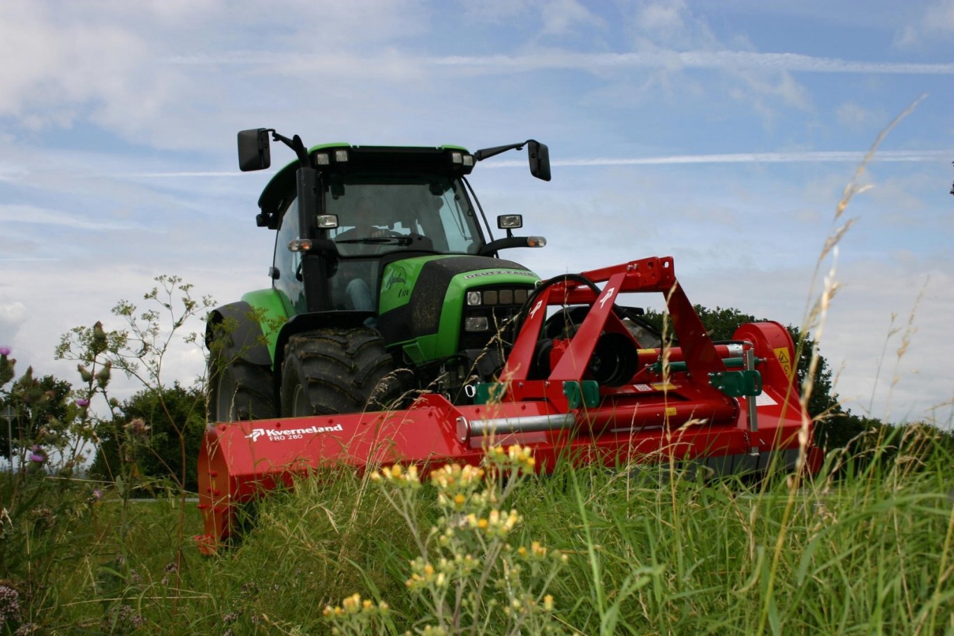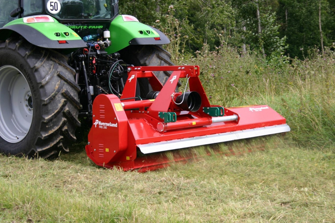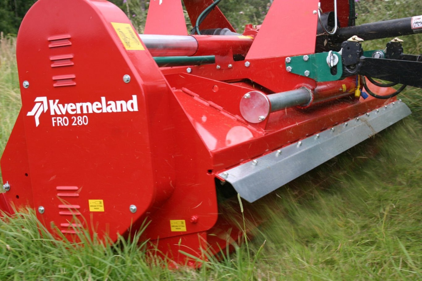 The Kverneland FRO is a new multipurpose chopper for chopping grass, pasture, set-aside land and stubble. A strong double headstock allows mounting the machine in front or behind the tractor. Together with the hydraulic offset it gives a multi-purpose versatility for nearly all conditions e.g. clearing out field edges, orchards road edges.