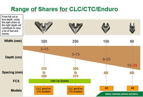 For the CLC/CTC/Enduro cultivator range, there is one point for each depth or tine spacing with the choice of shares in 80, 150, 250 and 320mm.