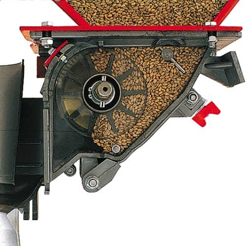 The central, totally enclosed cell wheel of the metering device accurately measures the required volume of seed and discharges it into the venturi cone where it is mixed with the air stream and then conveyed through the diffuser tube and the seed delivery hoses to the coulters.