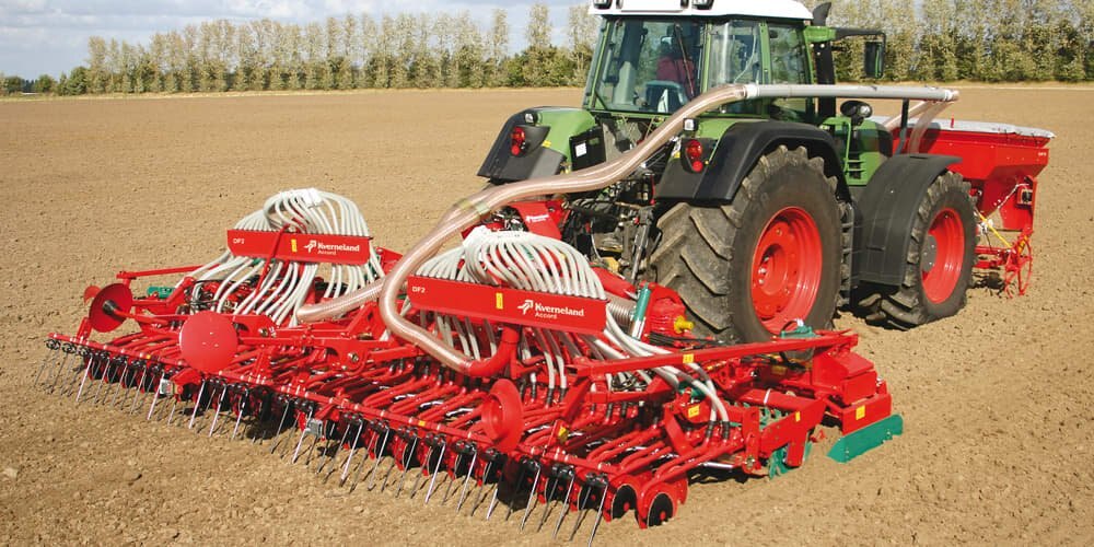 The Kverneland DF-2 has front twin hoppers feeding two metering devices. These are driven via the spiked landwheel, which runs on the right side of the machine. Hydraulic fan drives and landwheel lifting are available as options.