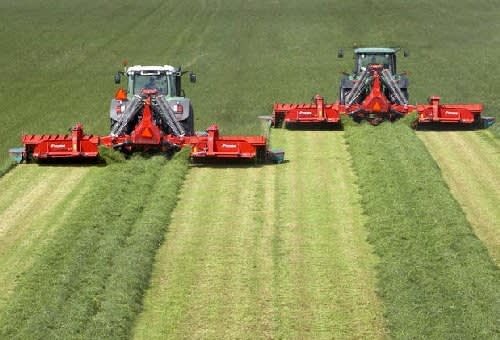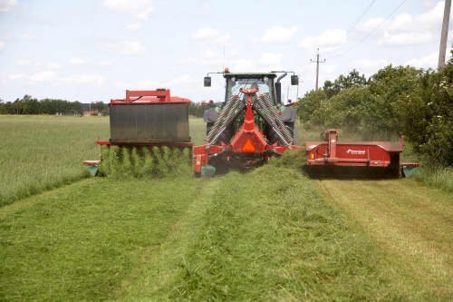 Kverneland offers a top-of-the-line butterfly mower conditioner combination with a 9.00m working width and swath belt. It consists of a 3632 FT or 3636 FT front mounted mower conditioner with 3.16 or 3.60m working width and two rear-mounted 3.16m mower conditioner units. |