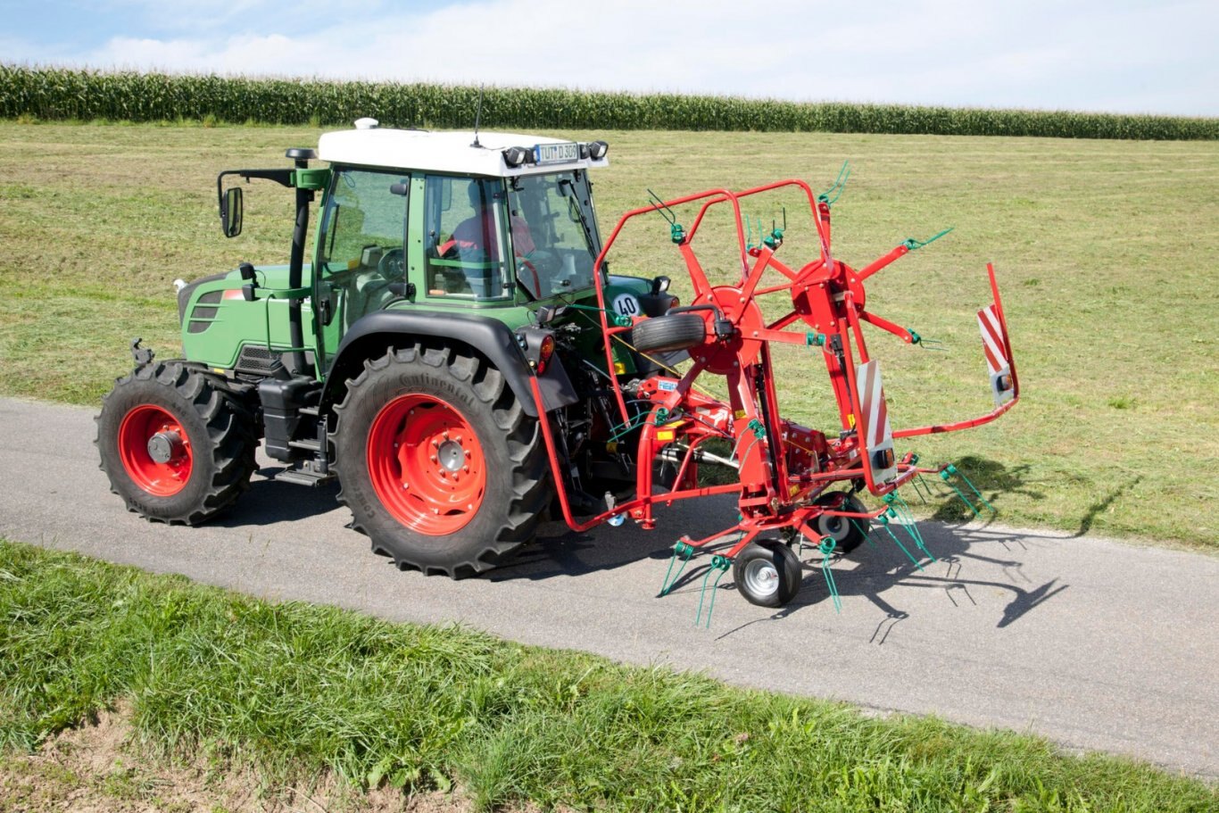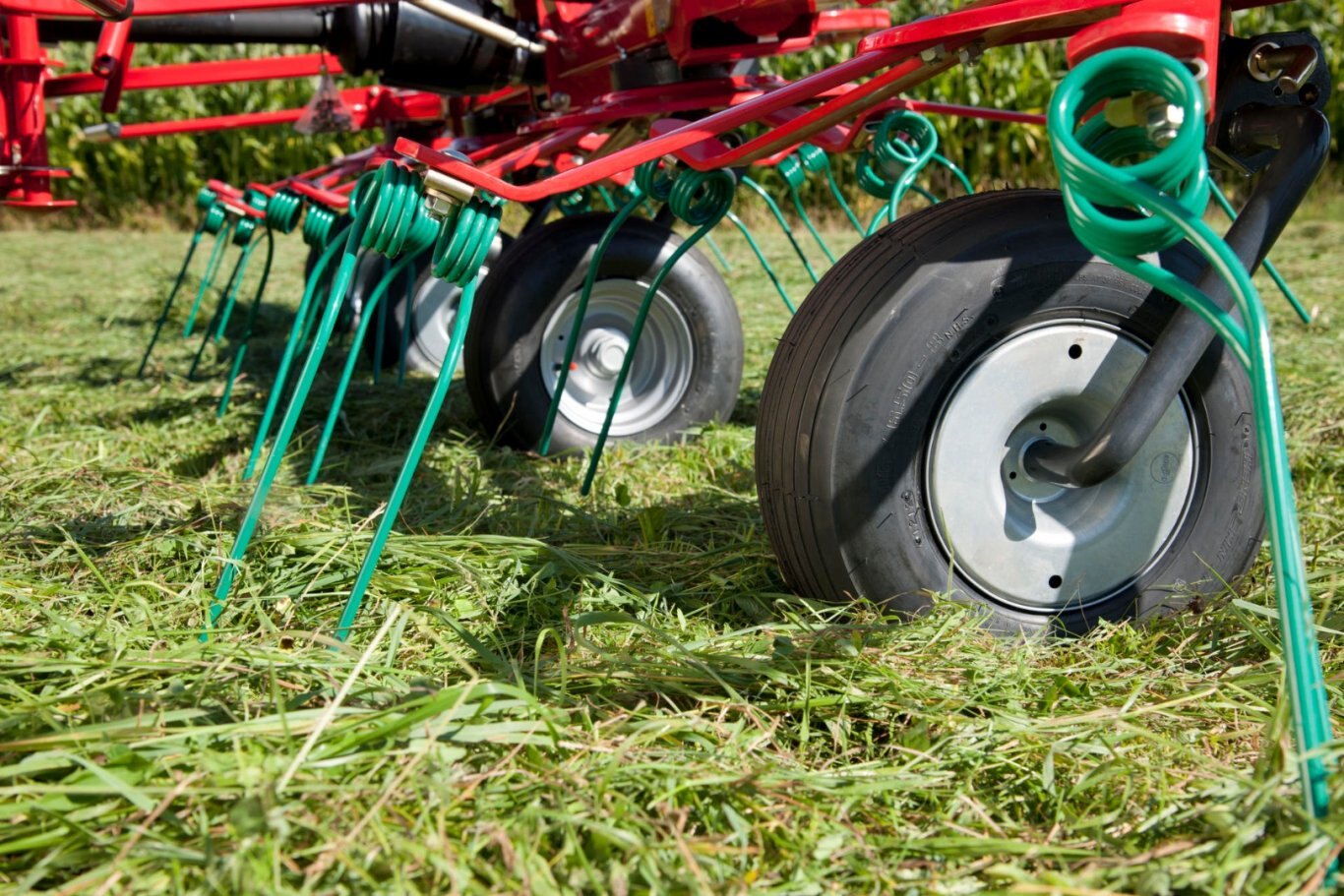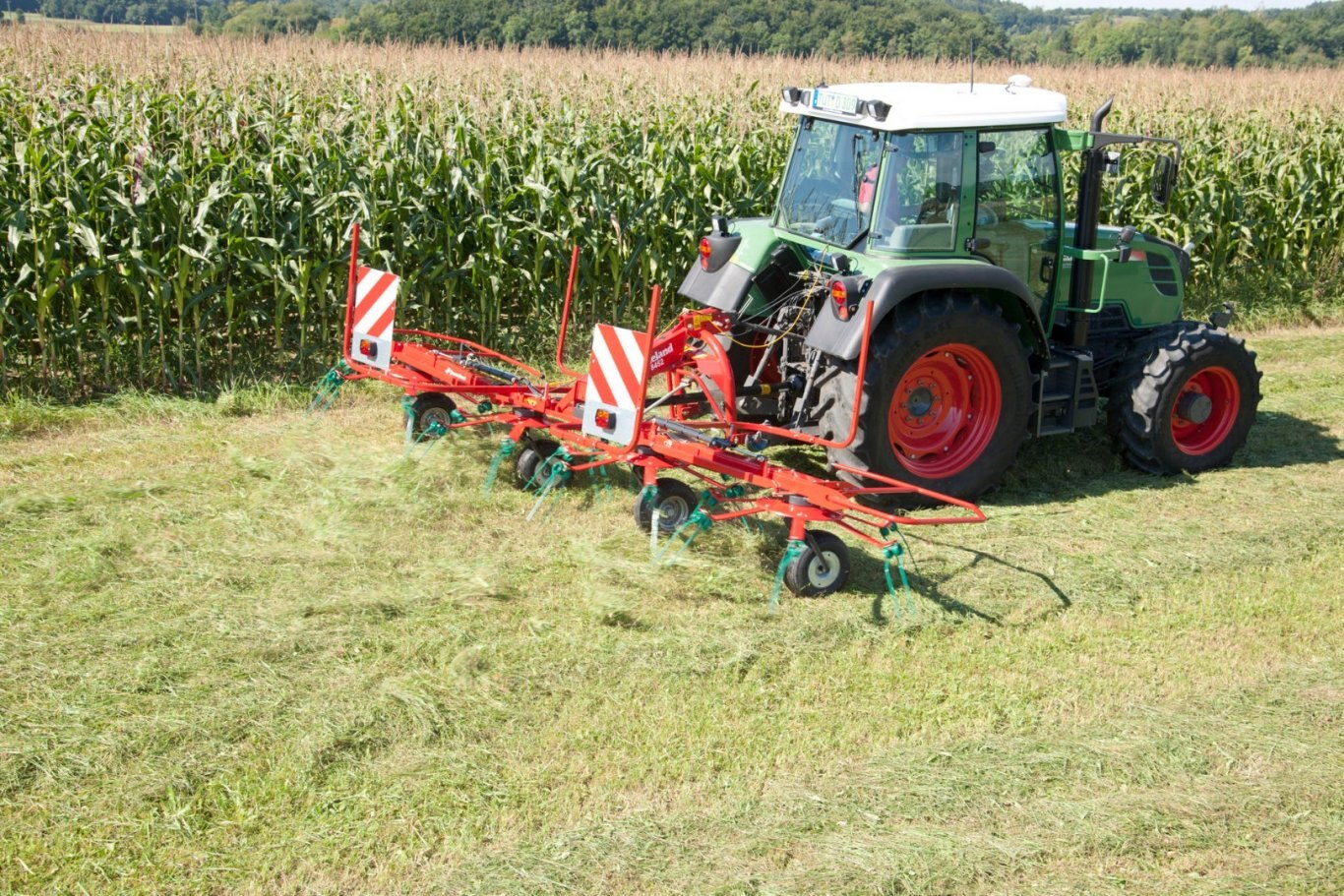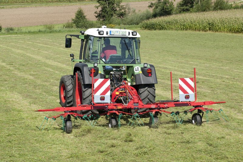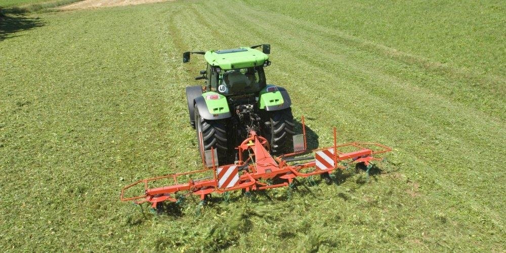 The mower swaths are neatly lifted by the tines and evenly spread over the full width.