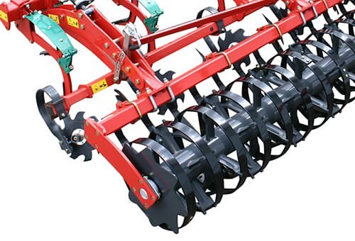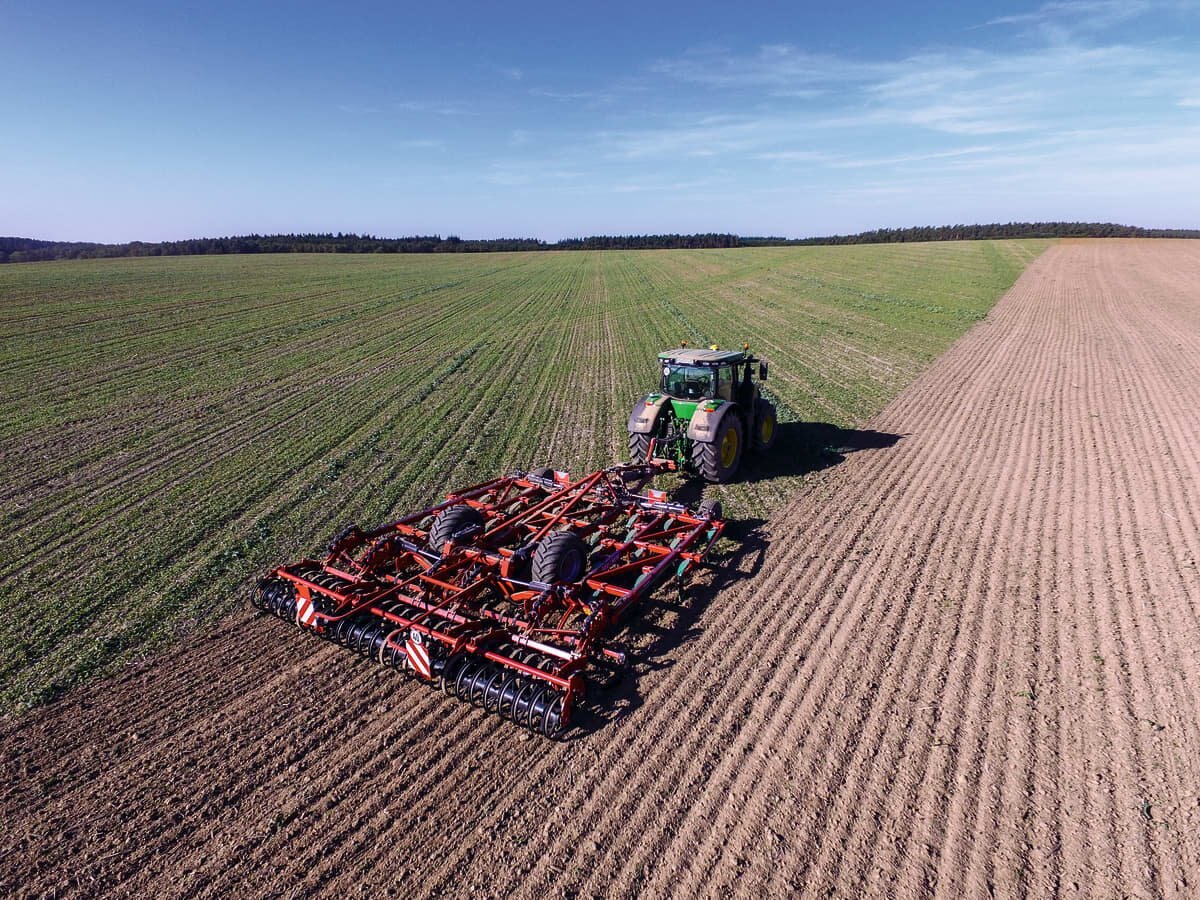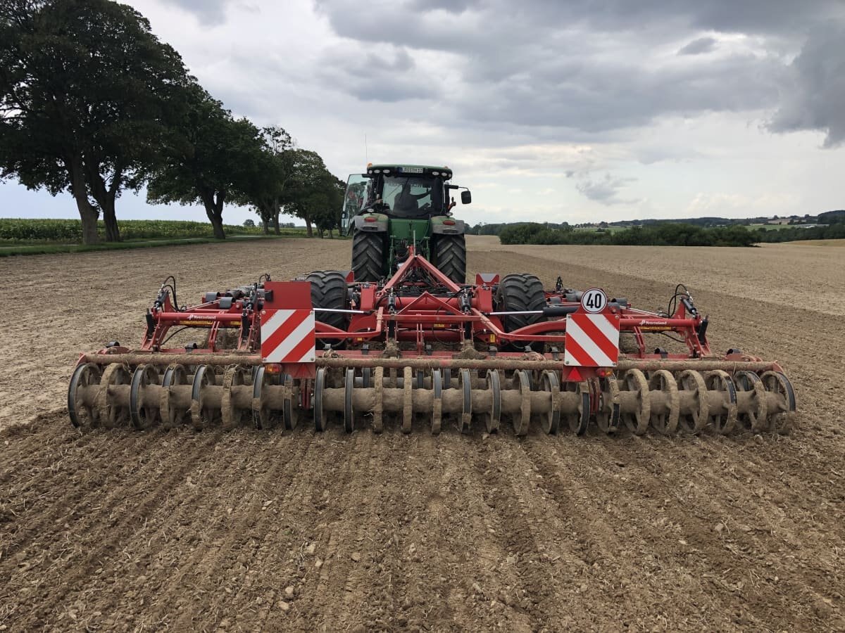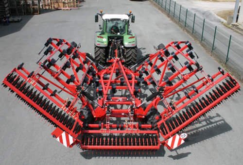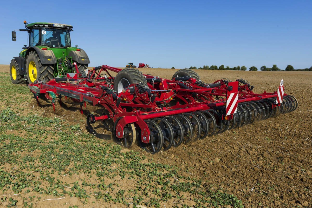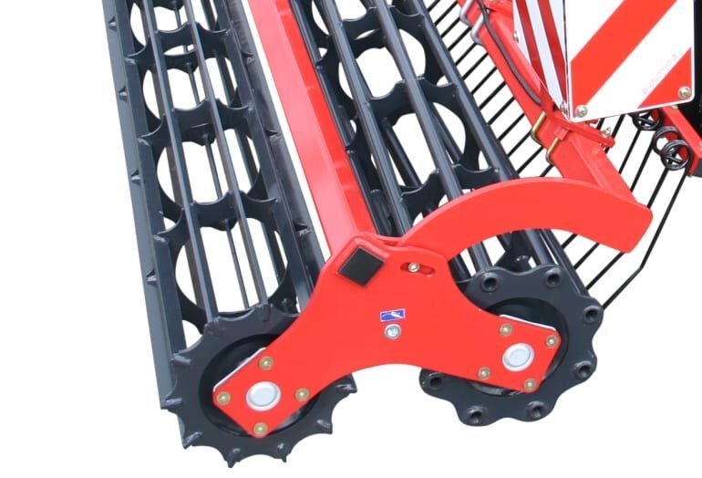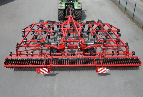 Perfect levellingLeaving an even surfaceIn order to create an even surface for a fine seedbed, Kverneland offers various options of levelling tools for the Turbo. There are levelling tines which are a very easy and economic way of levelling and to handle normal straw conditions on light to medium soil types. When it comes to heavy amounts of residues and also more clay or loamy soils the levelling discs are more suitable. Both versions are overload protected by a spring to avoid damages in stony or other difficult conditions. Individual springs ensure individual release of tines or discs and keep levelling quality even in stony conditions. The pressure on this spring and also the angle of the levelling discs/tines can be adjusted for a perfect results. To respect the transport width on the Turbo mounted versions with 3.00 and 3.50m working width the outer tines/discs can be hydraulically or mechanically folded in. A rear triple finger harrow provides levelling and controls weed development by pulling the weeds out of the ground so that the roots dry out in the sun. This is particularly interesting with rhizome and other weeds that could start growing again if they are pressed by a packer immediately after cultivation. Gauge wheels control the working depth of the machine. The triple finger harrow can be adjusted mechanically and the hydraulic pressure via the parallelogram. |