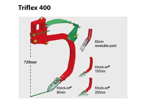 For stony condition and high penetration The auto-reset Triflex tine 400 uses the well known Kverneland leaf spring system to ensure a high point pressure of 400kg in work and a smooth release curve when the tine hits an obstacle. The Triflex tine 400 with narrow design and special shape reduces the pulling forces while ensuring a perfect penetration in most compacted soil. It is the perfect choice for deep loosening and working on heavier soil types strewn with stones. The Triflex tine 400 can be equipped with different shares to adapt to different working depths and tasks. 3 types of shares are available with the patented Knock-on® system. It is the easiest way of changing parts on a cultivator, either to adapt the machine to the job to be done or to change wearing parts. |