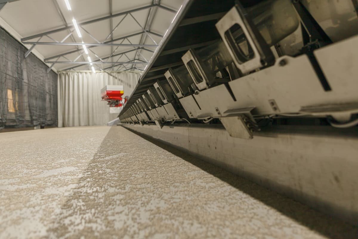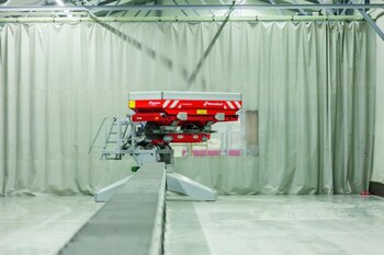 Spreader Competence CentreThe ultra-modern test facility in Nieuw-Vennep, The Netherlands, accommodates a high tech testing set up for accurate spreading charts for Kverneland spreaders. The test faciliy is unique in the market because of its highly advanced 3D test system and software set up, to analyse the results of many fertilisers in combination with our spreaders. It facilitates also more environmental friendly testing with focus on saving fertiliser, energy and fuel. The spreader and fertiliser test facility enables us to further grow in new developments and analyse the effect of new features on the spreading pattern of the spreader in a very quick and modern way. |