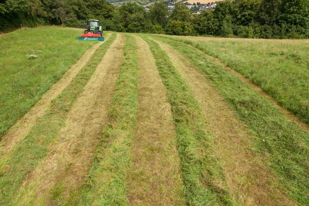 The Kverneland 2832 FS is not moving two swaths next to each other like drum mowers concept typically does, but places the crop into one even and airy swath. This significantly speeds up the drying process and prepares the speeds up the drying process