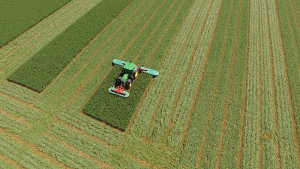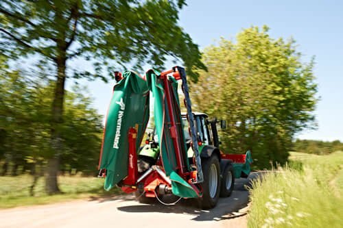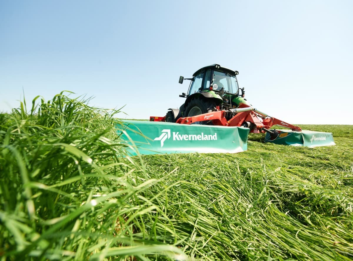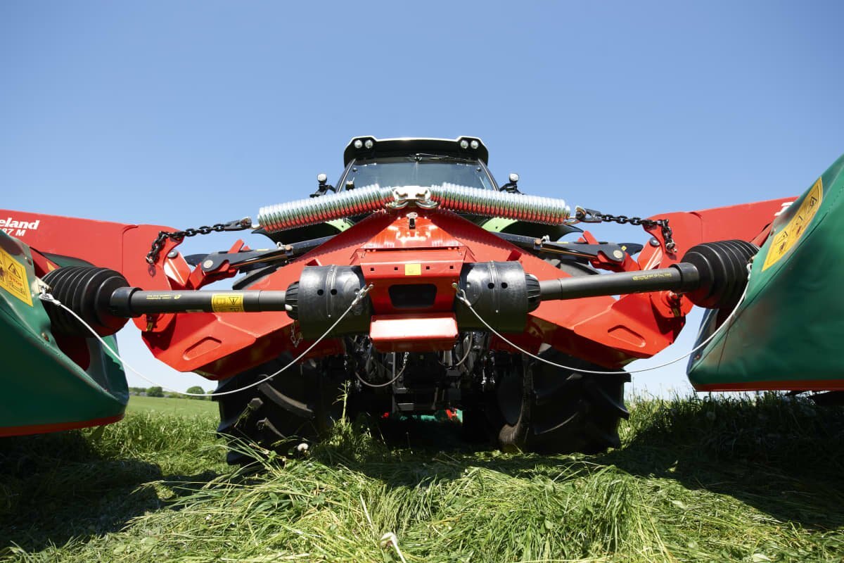 Kverneland disc mower butterfly combinations with low weight and high working width. Working widths of 8.70 and 9.50m. |