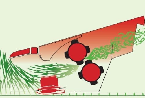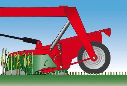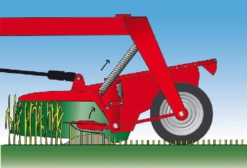 The cutterbar and the conditioner unit are suspended independently from the main chassis via two long adjustable springs, allowing ground contours to be closely followed. In addition the cutterbar also benefits from its own separate suspension mechanism, ensuring an even cutting height