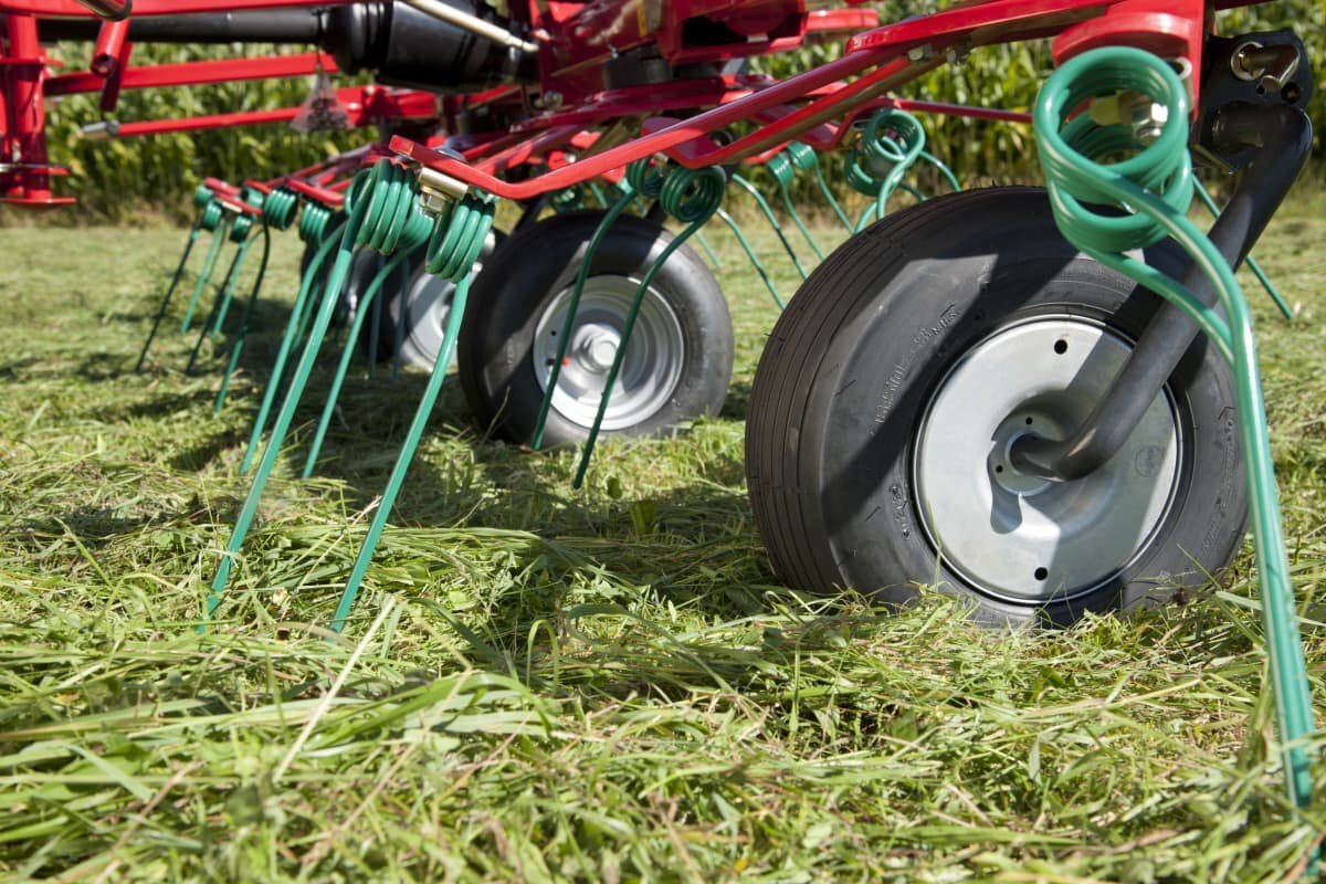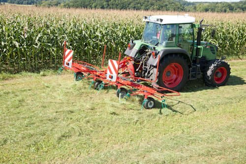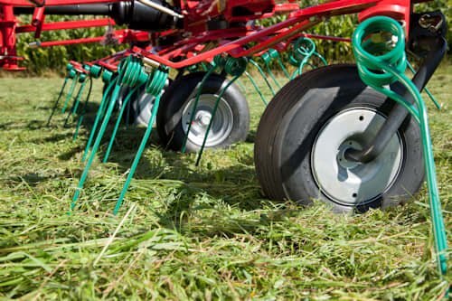 The mower swaths are neatly lifted by the tines and evenly spread over the full width.