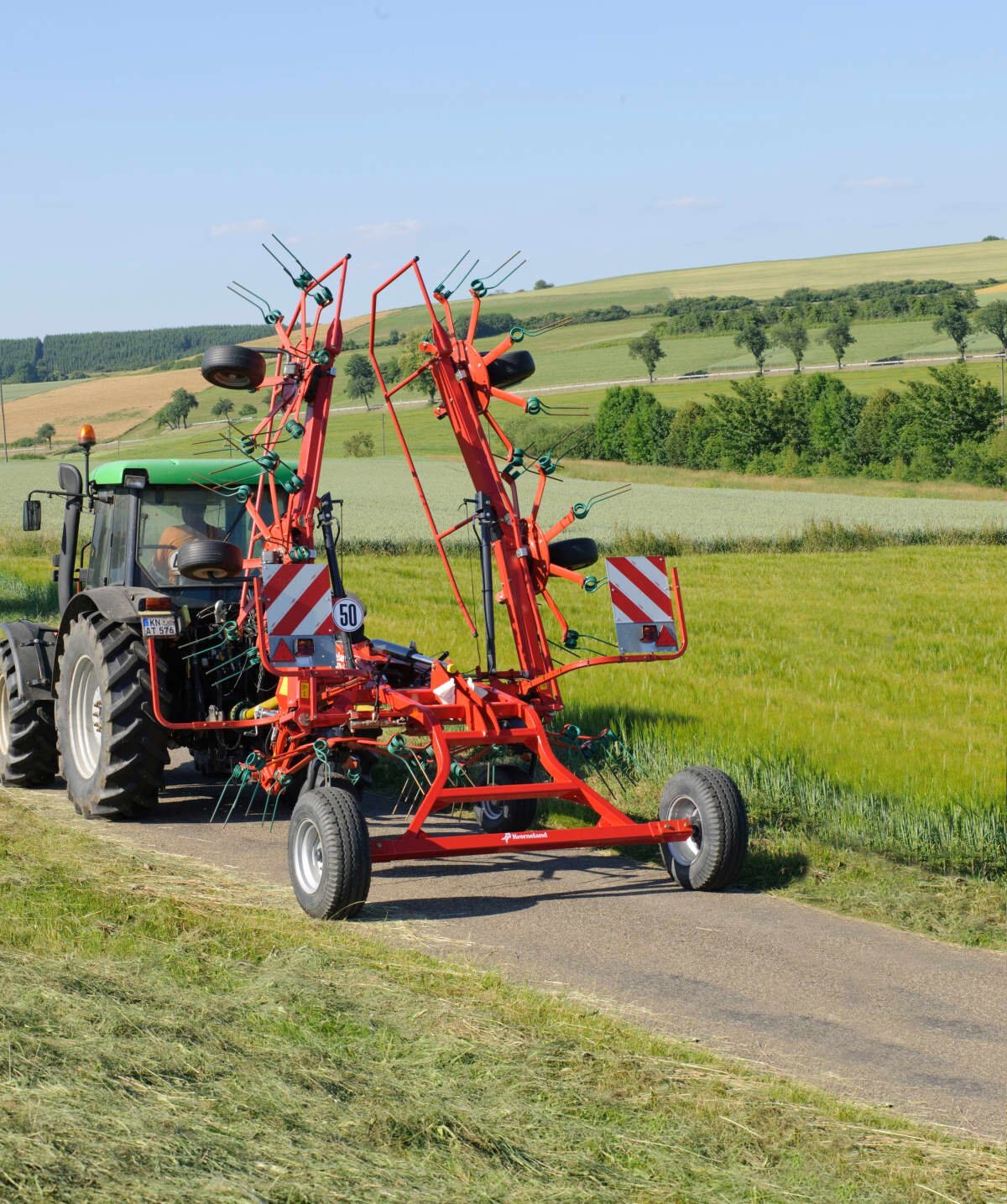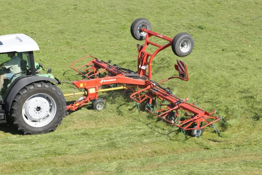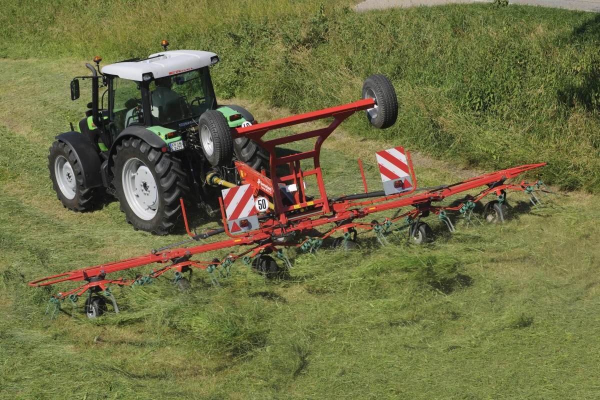 The mower swaths are neatly lifted by the tines and evenly spread over the full width.