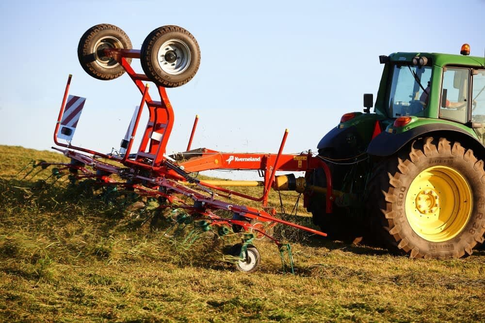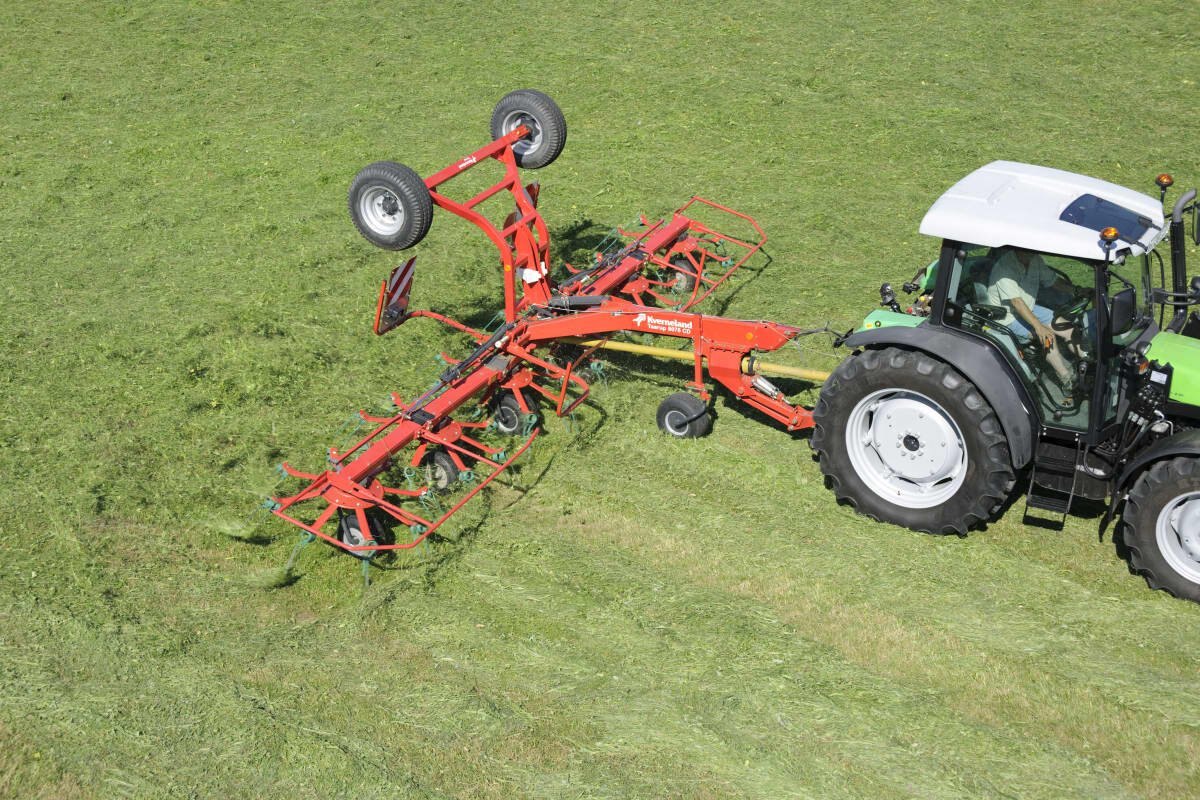 The Kverneland 8076 CD is designed for low horsepower/low liftpower tractors. The standard specification includes a hydraulic border tedding system for your convenience. In road transport, tedder weight rests on the running gear, rather than on the tractor’s rear axle. The optimized oil-immersed driveline makes for a low input requirement, so you can easily use a small tractor and still work a wide working width - the ideal solution that saves fuel and running costs.