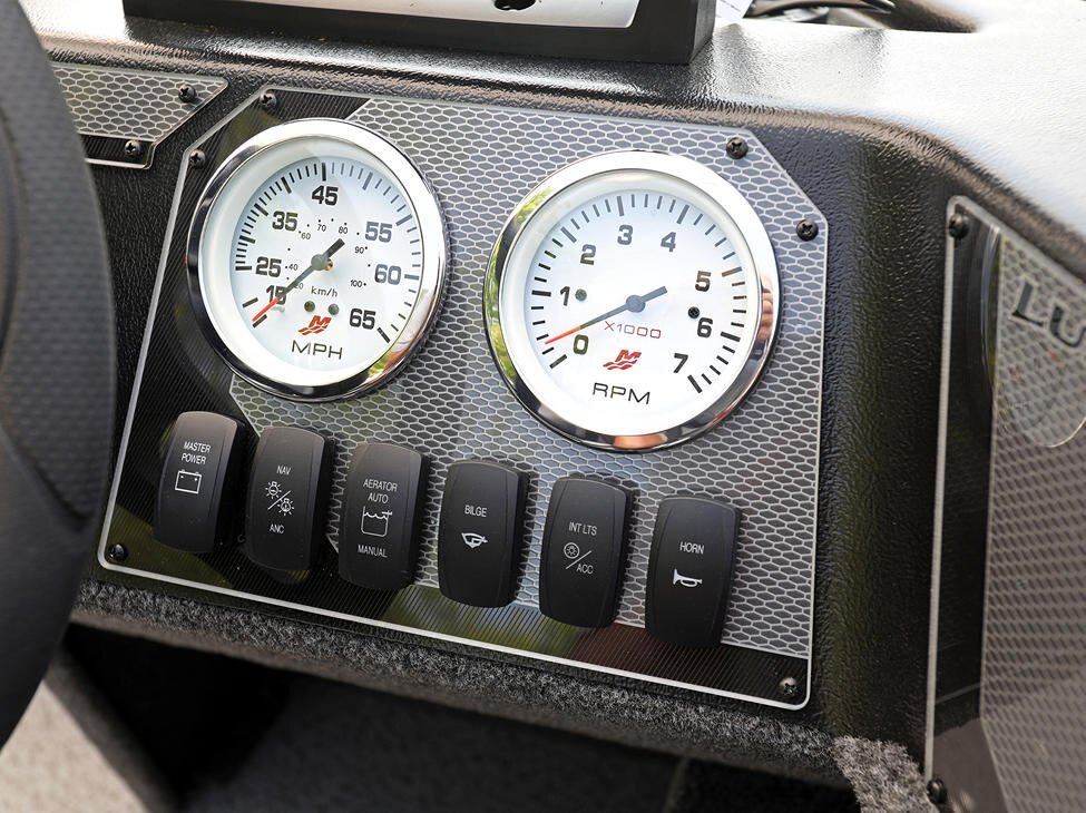 Consoles / Instrumentation / Lighting 12V Power Receptacle Custom Console w/Windshield Flush Mount Horn Interior LED Lighting Multifunction Gauges Navigational Lighting No Feedback Steering Plug-in Wire Harness Cell Phone Holder