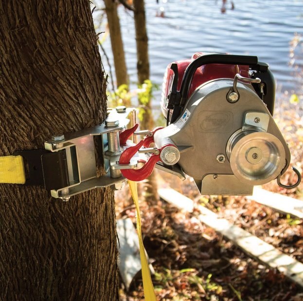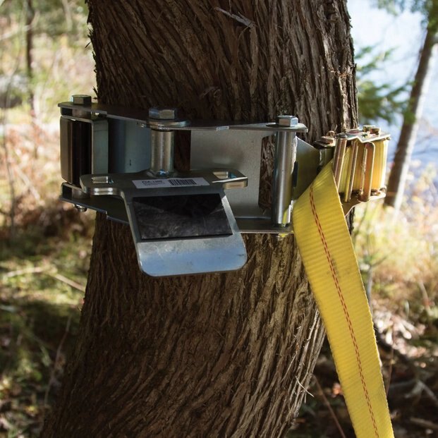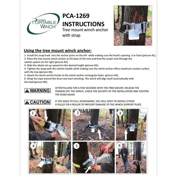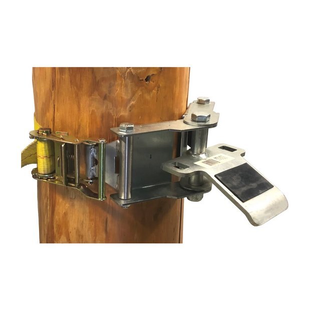 This anchoring device is designed for easy installation by securely tightening the 10-foot-long belt using the ratchet mechanism. The winch can then be effortlessly positioned at a comfortable working height by attaching its hooks to the square openings of the anchoring's swivel plate, ensuring automatic alignment with the load. It is suitable for use with trees or poles ranging from 12 inches to 36 inches in diameter and includes a durable 2-inch by 10-foot strap.
