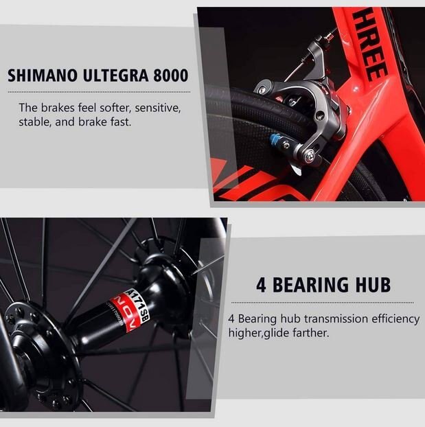 TORAY T800 Carbon Fiber: We use high quality Japanese Carbon fiber frame, wheelset, fork, handle bar and seat post. Provides an ultra-light carbon road bike at about 7.9 kg (17.4lb). (The new frame for the model in 2021 is a new design, which is different from the old model. ) SHIMANO Ultegra Group Set- SHIMANO Ultegra 8000 2*11 Speeds with Shifter lever, Front derailleur, Rear derailleur, V Brake, 50-34T*170mm Crankset and 11-28T Freewheel - It enables you to start and operate your ride effectively, smooth shifting and durable. |