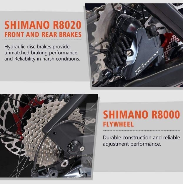 T800 carbon fiber frame, fork, seat post, wheelset Lightweight:9.9kg(21.78lbs) Internal cable routing design SHIMANO UlTEGRA R8000 Hydraulic disc brake 700*40C Continental tire KMC chain 90% pre-assembled