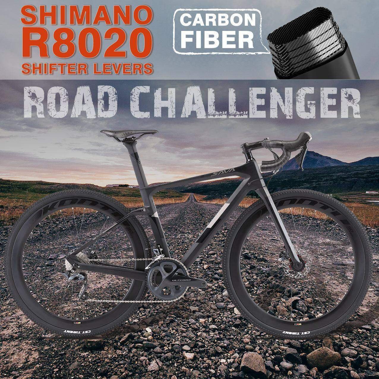 The SAVA Trailblazer 8.0 Carbon Gravel Road Bike is the perfect ride for tough terrains. This 22-speed bike features a lightweight carbon frame, Shimano ultegra components, and hydraulic disc brakes for reliable and efficient stopping power. Get ready to journey in comfort.