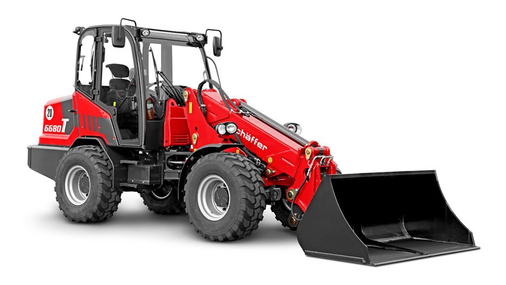 Deutz Turbo diesel engine, 4 cylinders, water-cooled, 55 kW (75 HP) DOC and DPF for compliance with Stage V emissions standards Hydrostatic four wheel drive with automotive control Tyres 400/70-20 AS, offset 0 HTF (High Traction Force) SPT (Schäffer Power Transmission) Hydraulic quick gear 20 km/h switchable under load HD planetary axles with self-locking differentials; (8-hole) Rear pendulum axle Ferro-form sliding elements in the telescopic arm Tool cylinder in the telescopic arm Pressure relief of hydraulic couplings Combined oil cooler Hydraulic fan drive SCV-cabin (Silence, Comfort, View) Multiple disk brake, maintenance free; service and parking brake Maintenance free articulation joint 2 x working headlights front und 1 x rear Lighting system without ABE (General approval certificate) according to ordinance StVZO Z-bar boom with parallel lift Working hydraulics: 74 l/min, optional 88 l/min. Depressurised return Steering column adjustable in length and angle Hour meter, rev, counter, fuel control lamp and temperature indicator Adjustable armrest Rear weight end plate and towing hitch Main battery switch Cyclone Headstock type wheel loader with hydraulic tool lock