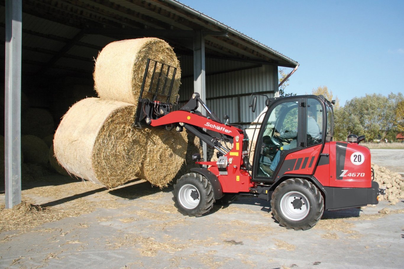 Traction hydraulics: Hydrostatic-automotive Axles: Original Schäffer axles, 6 wheel nut rim; planetary axle and automatic limited slip brake Speed / option: 0 - 20 km/h in 2 gear switchable under load / 0 - 30 km/h Brakes and steering Service braking system: Combined brake hydrostatic and multi-disc brake Parking brake: Multi-disc brake running in oil bath Steering: Fully hydraulic articulated-swivel steering