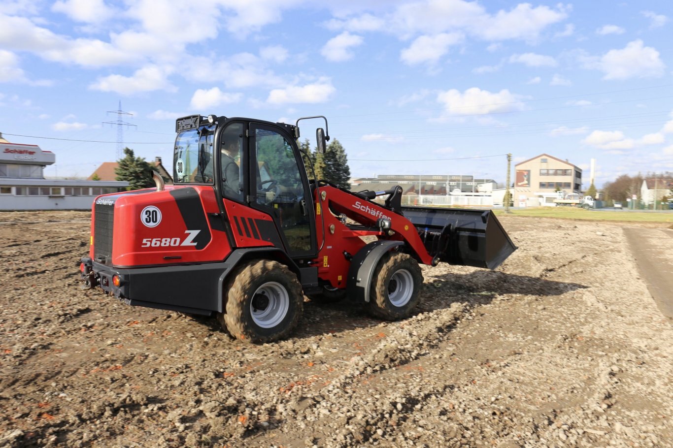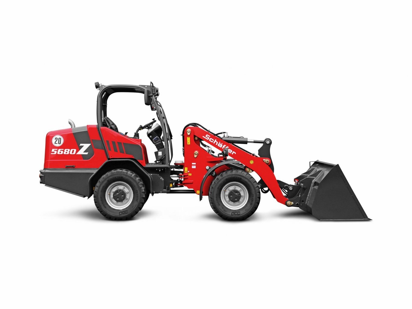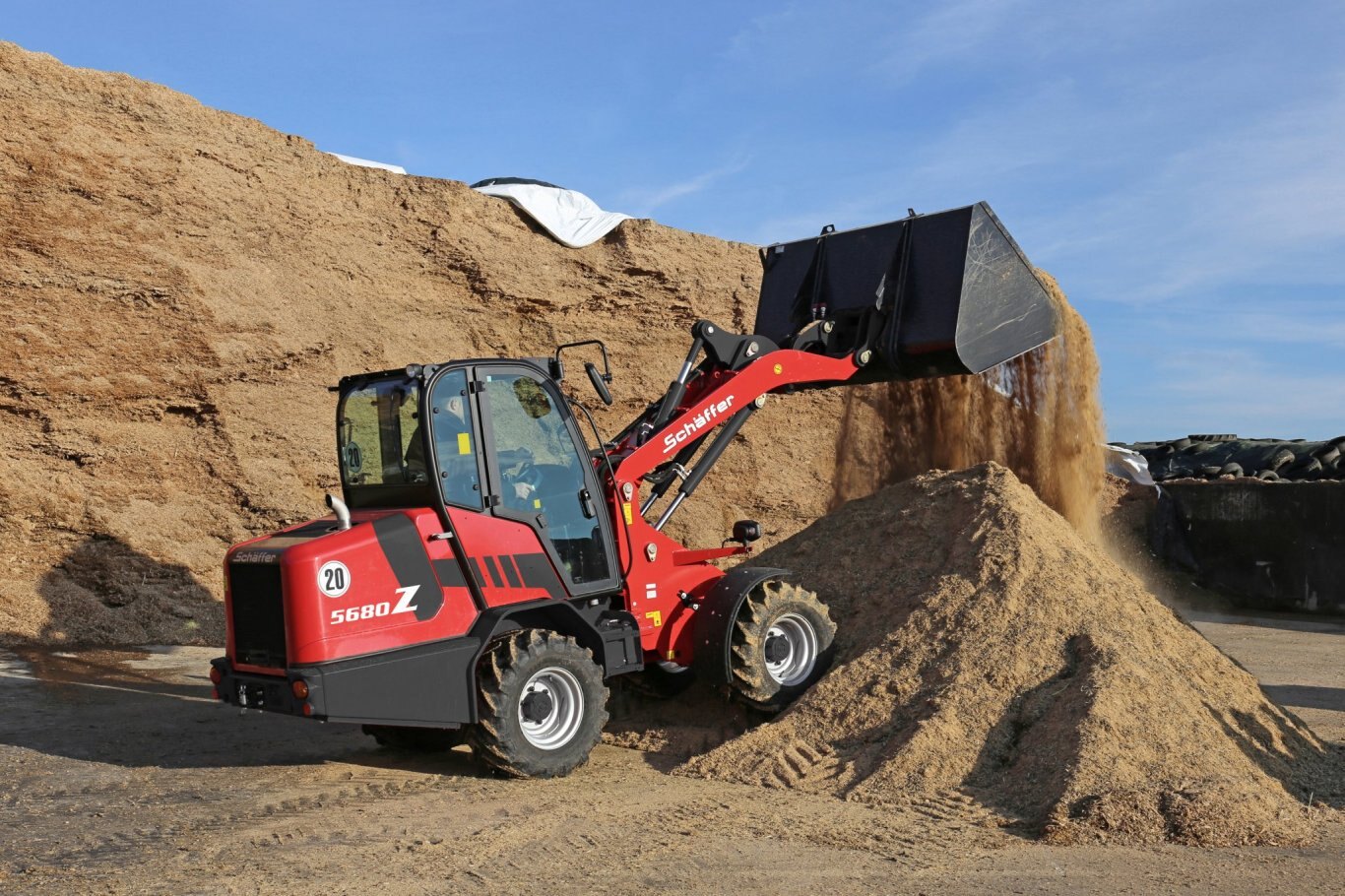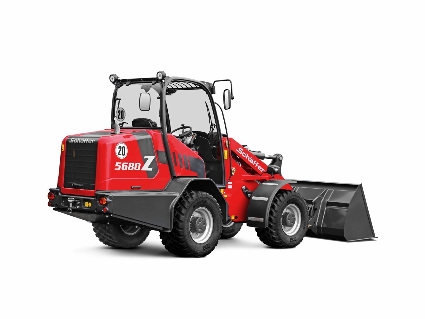 Traction hydraulics: Hydrostatic-automotive Axles: Original Schäffer axles, 8 wheel nut rim; planetary axle and automatic limited slip brake, swing axle at rear Speed / option: 0 - 20 km/h in 2 gear switchable under load / 0 - 30 km/h