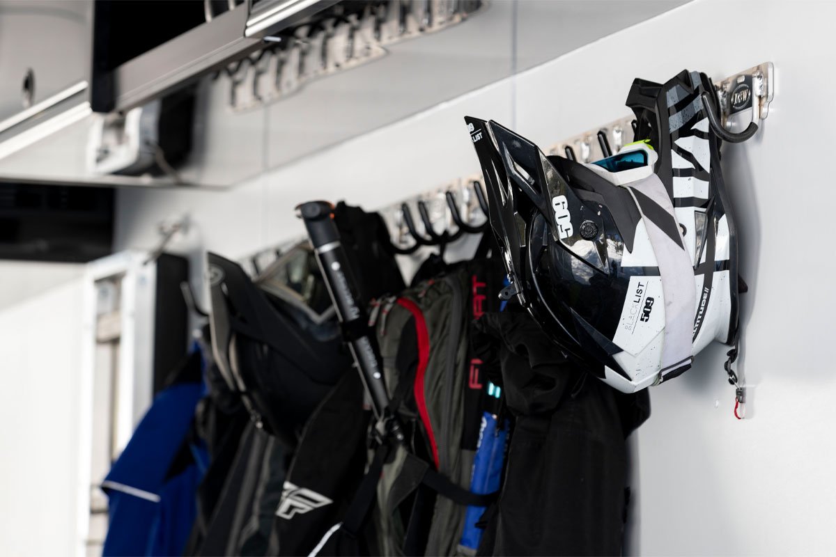 Coat hangers that can be attached to the walls and ceiling help you keep your adventure gear organized and your trailer floor clear. |