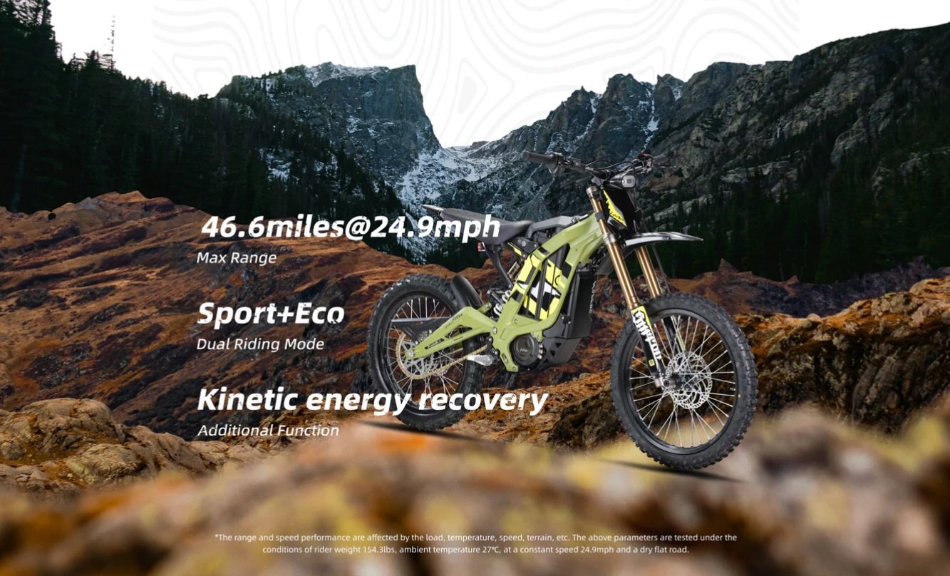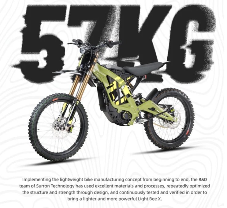 Part dirt bike. Part MTB. All electric.With 8 kW of electric power, a 75 km cruising range, a top speed of 75 km/h, and a curb weight of just 57 kg, the 2025 Surron Light Bee X sets a new standard in premium electric off-road technology. The 2025 Light Bee X has evolved into a worldwide icon, loved for its accessibility, edgy design, zero emissions, and noise-free operation. Its lightweight forged aluminum alloy frame is paired with an advanced off-road suspension system, making it perfect for this high-performance electric platform. Easy to handle and maneuver for beginners, the Light Bee X also excites seasoned off-road enthusiasts with its ability to tackle even the toughest trail obstacles. Delivering a climbing ability of over 45 degrees, up to 75 km of range with optimized efficiency, and a fast charging time of just 2 hours, the 2025 Light Bee X offers endless thrills on any terrain. Featuring a powerful 60V/40Ah lithium-ion battery, adjustable throttle curve, and a lightweight design, this model is ready for adventure. |