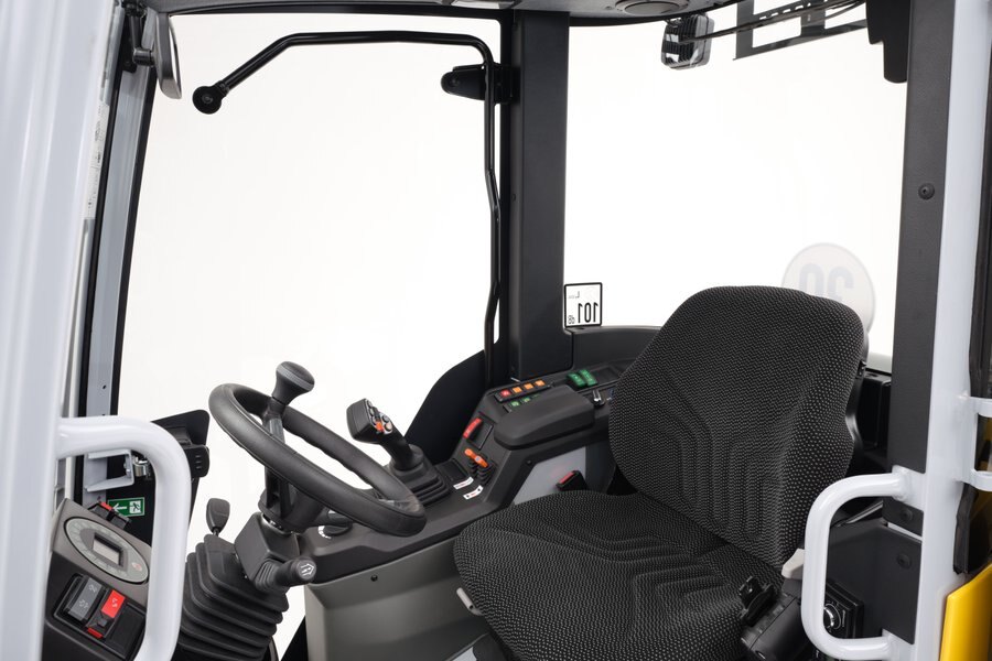 - All control elements are within easy reach and the operator always has the most important machine information in view via the optimally positioned display. The switches and controls are divided into different color groupings: Gray = electrical, Red = safety, Blue/Orange = drive system, Green = hydraulics. This ensures quick recognition and orientation at all times.
