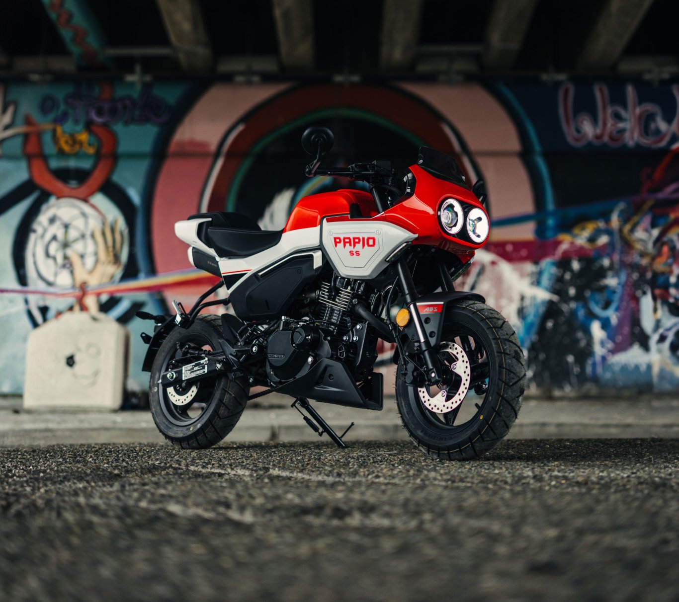 With a retro-sport motorcycle design that pays homage to '80s classics, the PAPIO SS's twin-headlight design breaks away from traditional constraints and starts a new trend. The 126cc engine, with a 6-speed transmission and chassis, is the epitome of today's engineering. Make it big. PAPIO SS refuses to blend in with the traffic, which will shine when it rushes through the crowds.
